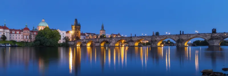 Moody blue dawn tones over Charles Bridge and the Vltava River, a peaceful Prague photography moment.