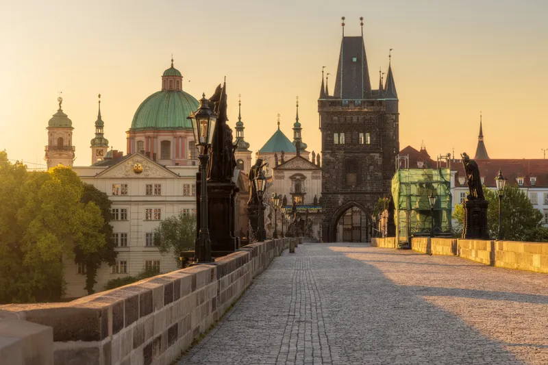 Iconic Charles Bridge at sunrise, where historic statues meet glowing morning light.