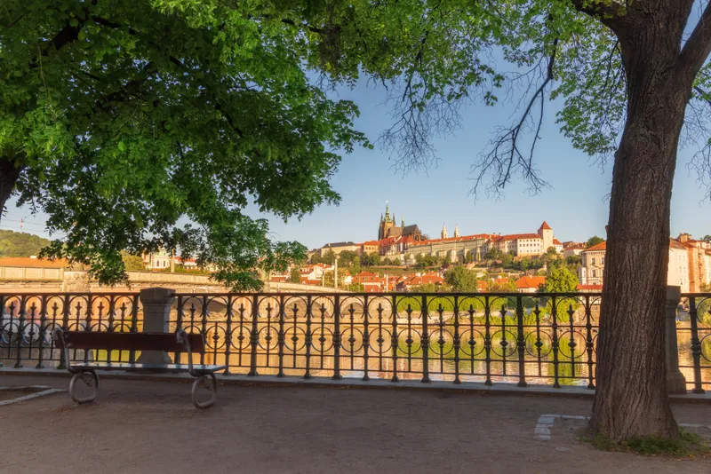 Panoramic cityscape from Letná Hill, showcasing the rooftops, bridges, and skyline of Prague.