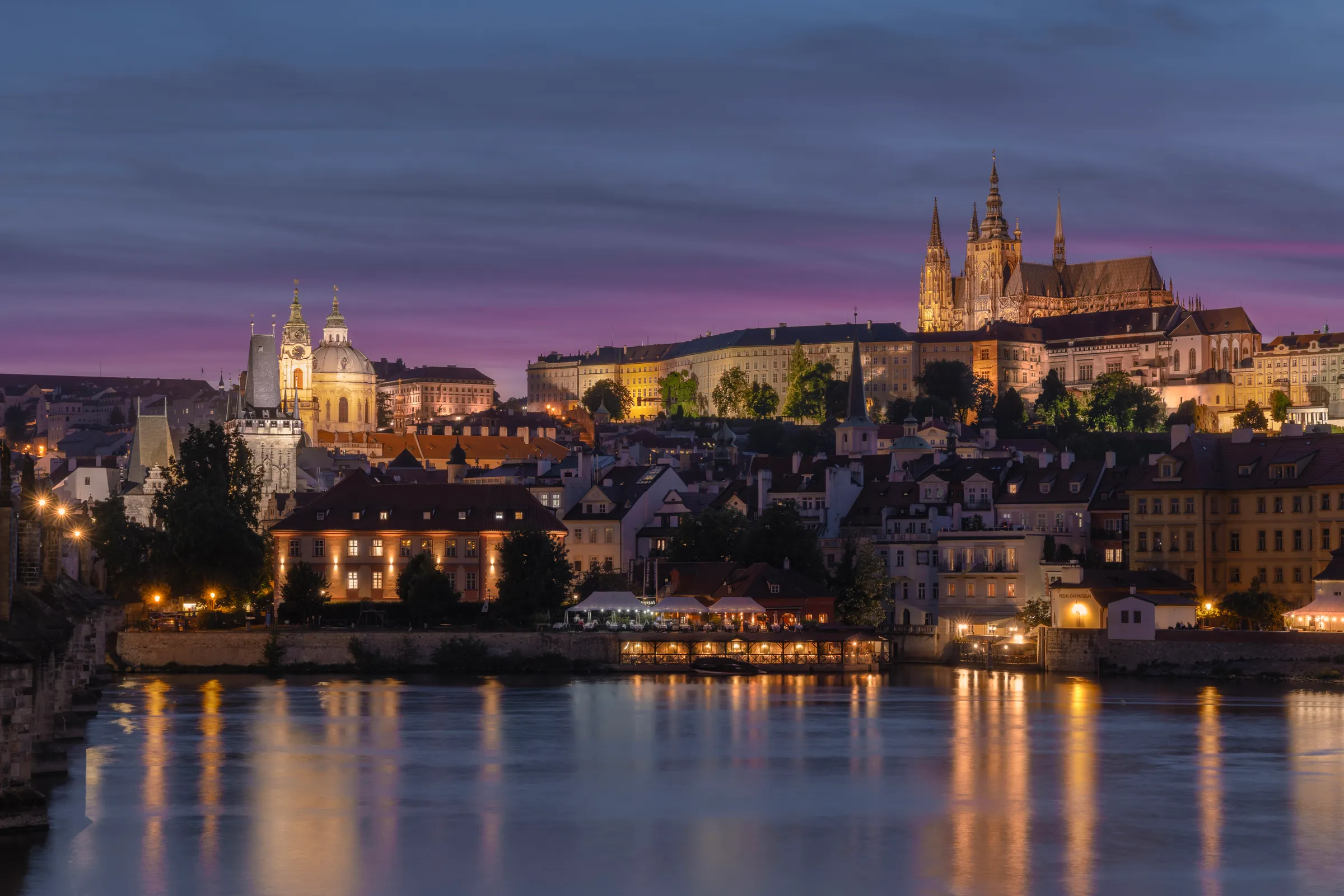When you look at this photograph, I want you to feel that timelessness—standing on the Vltava riverbank watching Prague Castle glow at dusk, where the 9th-century fortress, 14th-century St. Vitus Cathedral, and 18th-century baroque palaces rise above Malá Strana, all reflected in the river that's flowed through the heart of Prague for centuries in the Czech Republic.