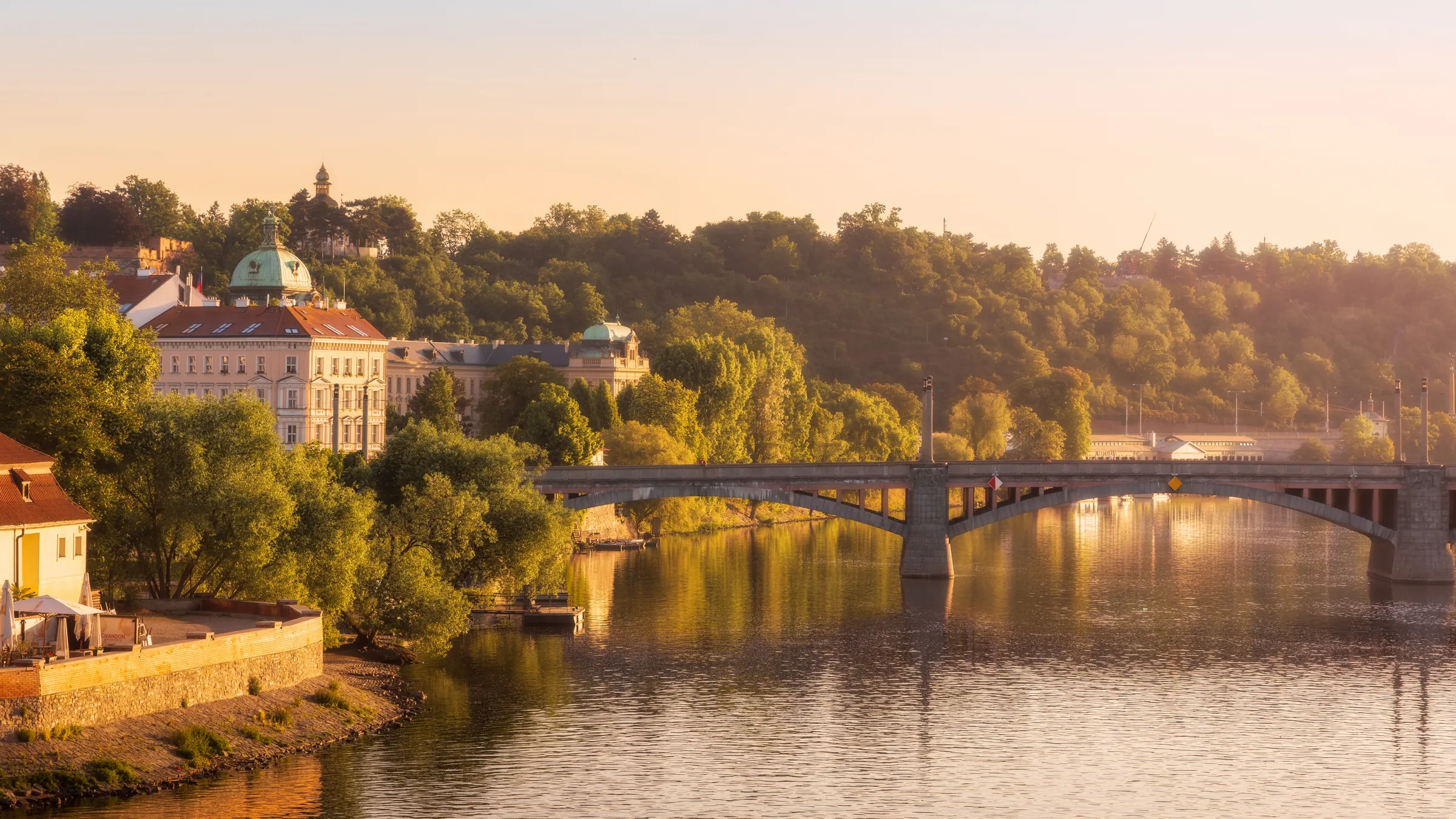 Early sunrise light over a Prague bridge on the Vltava River, framed by soft pastel skies.