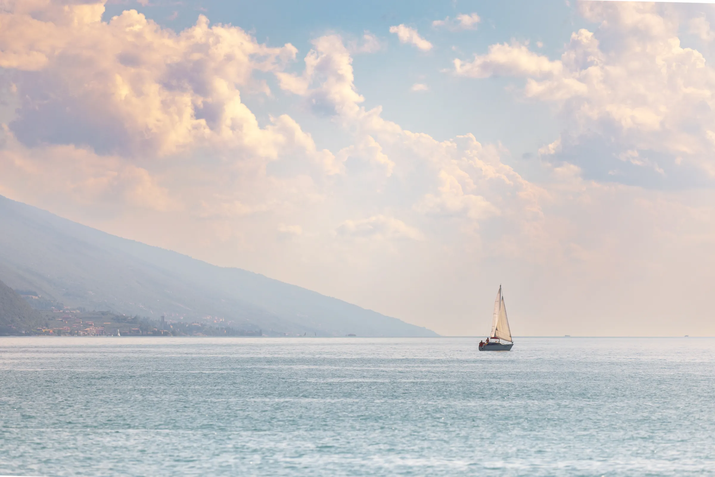 A peaceful sailing boat gliding across the calm waters of Lake Garda, Italy, under soft pastel skies and drifting clouds.