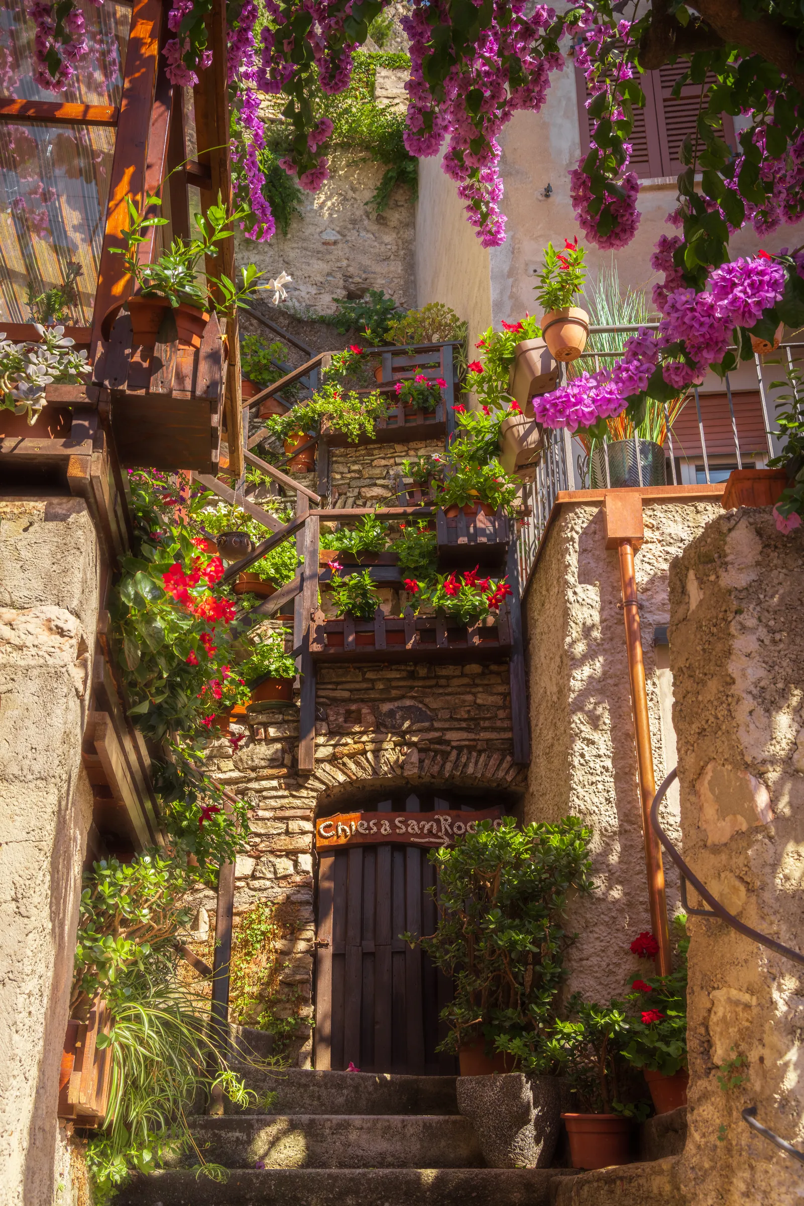 That’s when I found this scene. A tucked-away staircase overflowing with flowers, sunlight spilling across stone walls, and a small wooden sign reading Chiesa San Rocco. It stopped me in my tracks — simple, beautiful, and unmistakably Italian. It was a scene where I didn’t need to think about composition as it had already done all the work by itself; I just knew I had to capture it.