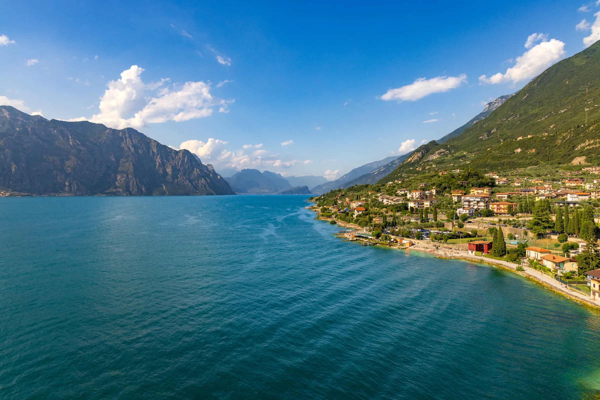 A sweeping view looking north across Lake Garda from Malcesine, Italy, with mountains and lakeside villages lining the horizon.