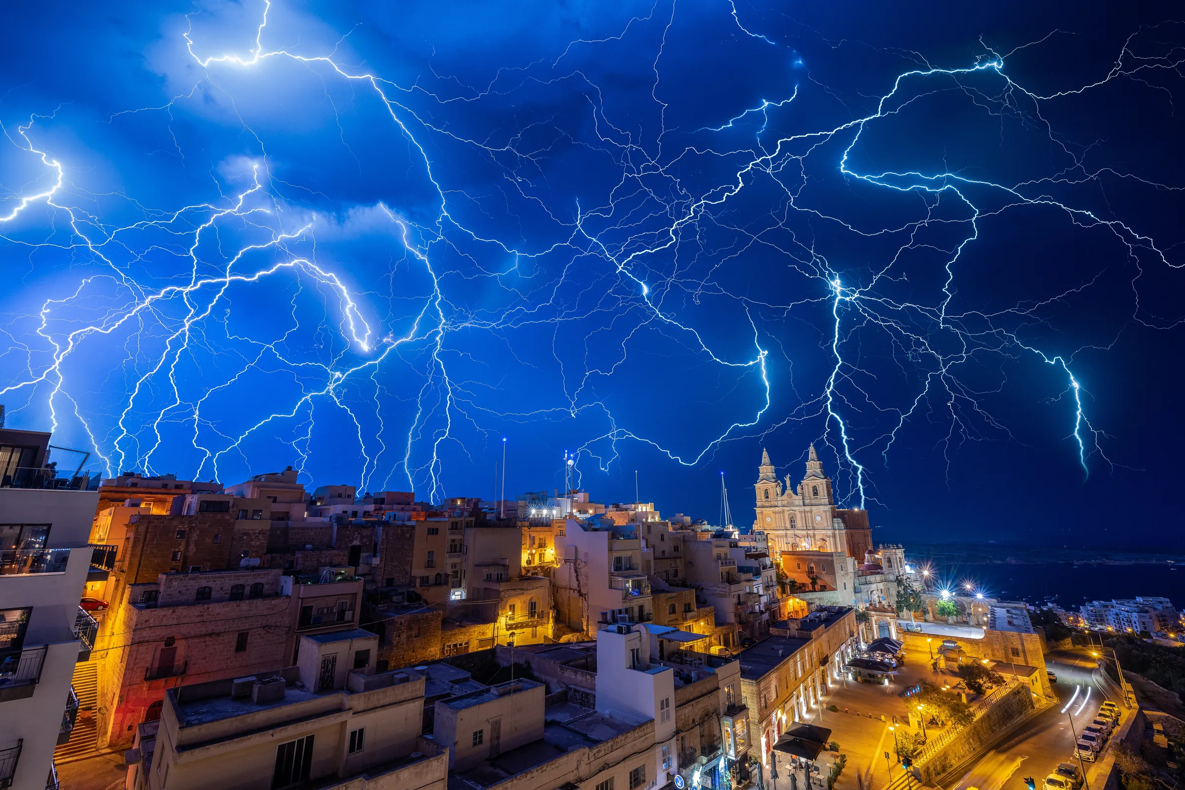 The Parish Church's twin bell towers—completed in 1881—stand resilient against the electrical display, grounded literally and figuratively while nature's voltage rips through the clouds above. Malta's position in the central Mediterranean means it sits at the meeting point of different weather systems, creating dramatic conditions when they collide over these small islands.