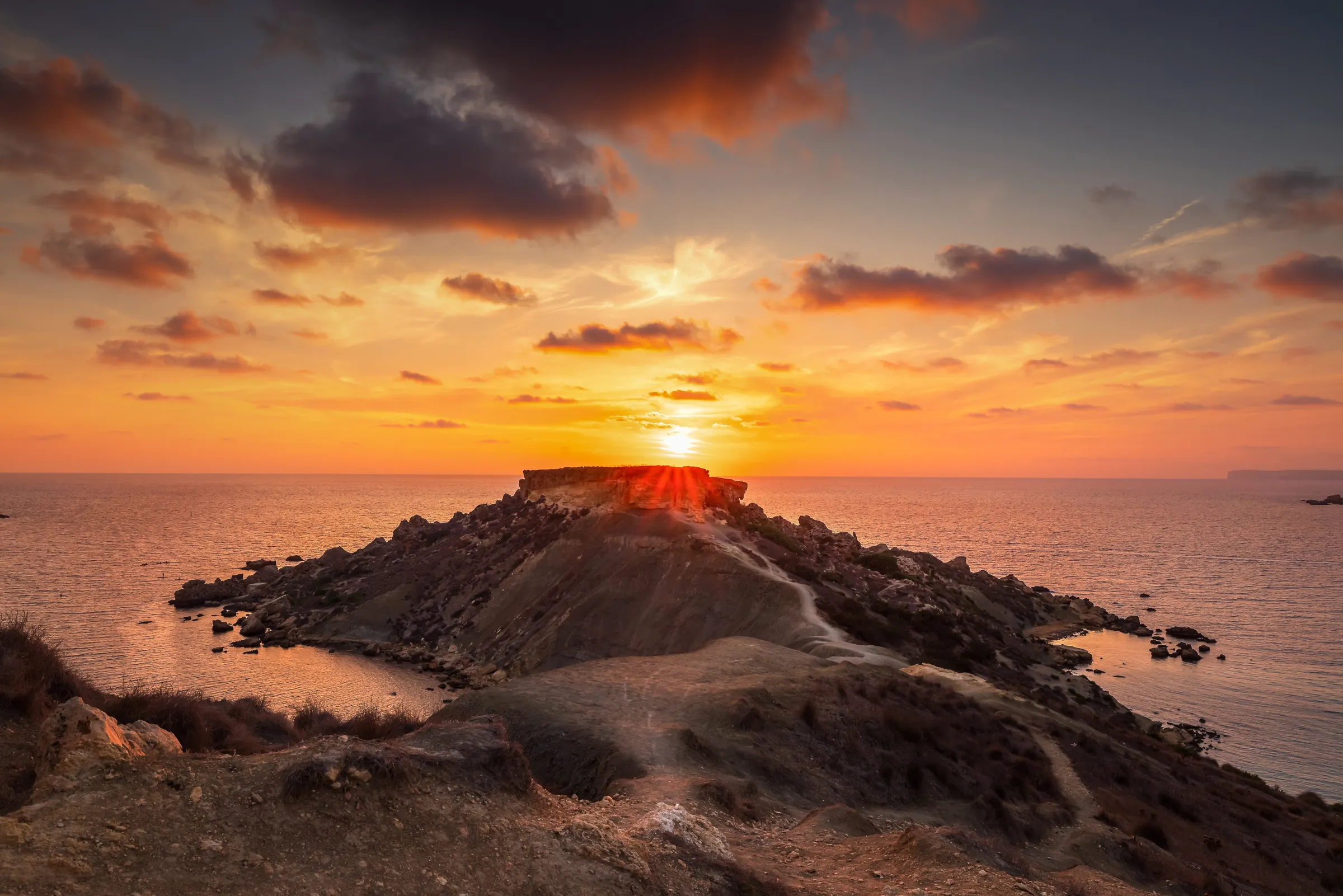 Qarraba Bay is accessed by rough trails through the garigue—Malta's unique Mediterranean scrubland of wild thyme, rock roses, and hardy grasses that somehow survive in the thin soil on top of the limestone. I watched as the sun aligned right over the ridge, the kind of alignment you get at the end of August when the sun's setting position shifts noticeably south each day. The sky lit up in waves of orange, gold, and pink—the kind of color you just stand and stare at for a while.