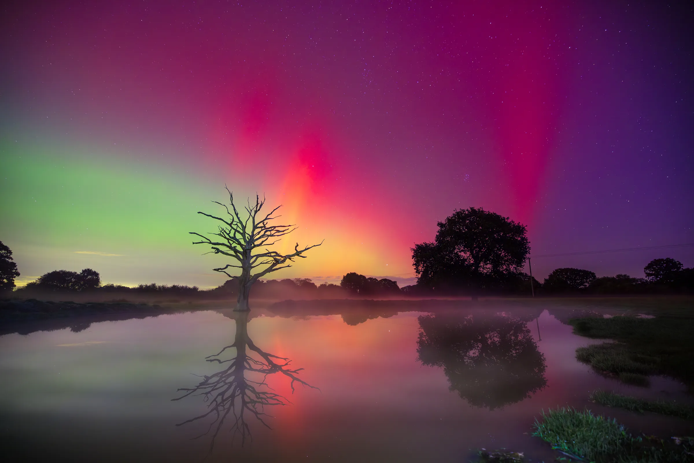 In the foreground, a solitary, lifeless tree stands in stark contrast against the vibrant backdrop, its reflection perfectly mirrored in the still waters below. The delicate mist hovering over the landscape softens the transition between sky and earth, adding an otherworldly atmosphere to an already breathtaking composition. The aurora’s colours appear to ripple, as if the very air itself is alive, pulsing with unseen energy.