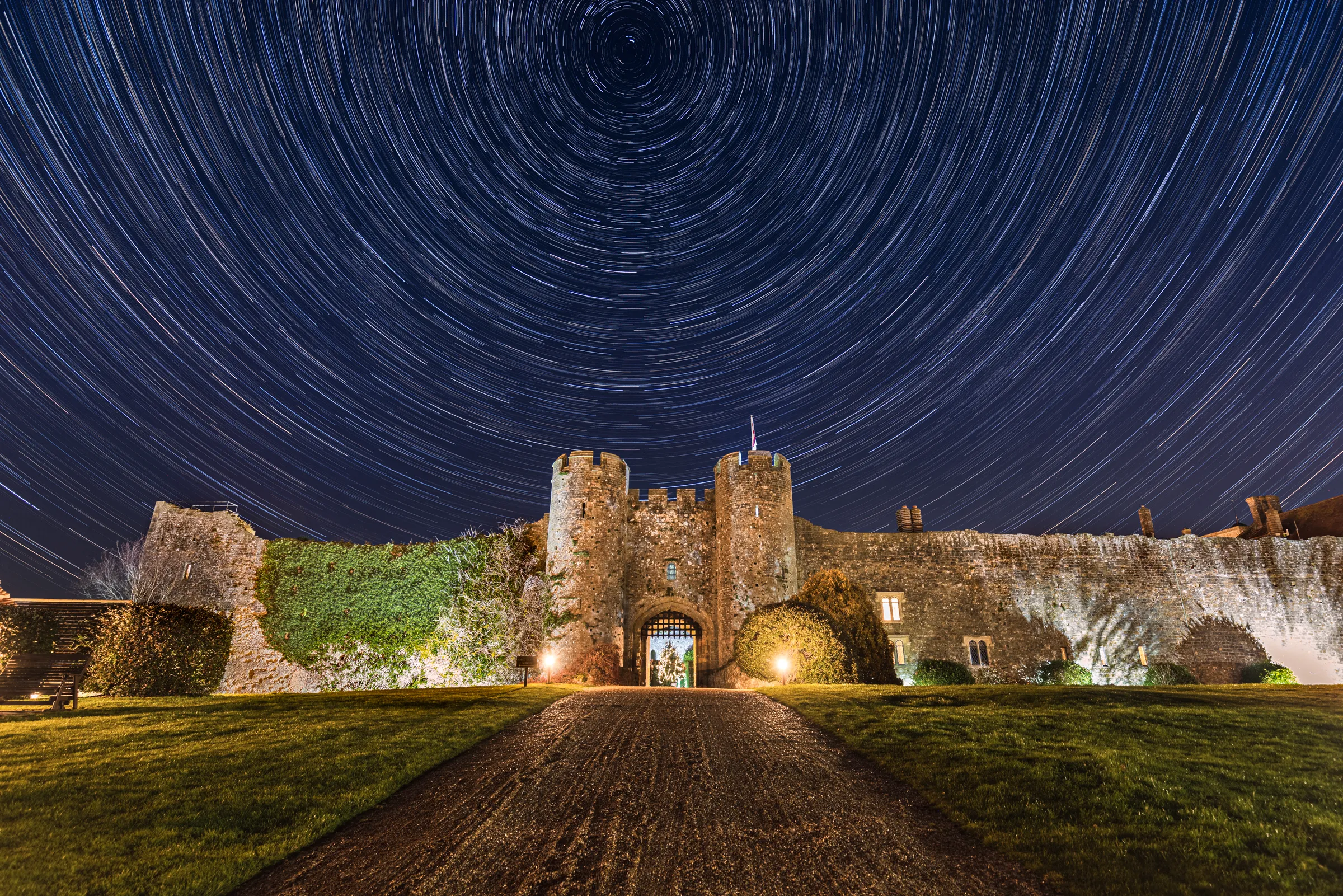 Star trails swirl above the historic Amberley Castle, West Sussex, creating a magical night-sky scene.