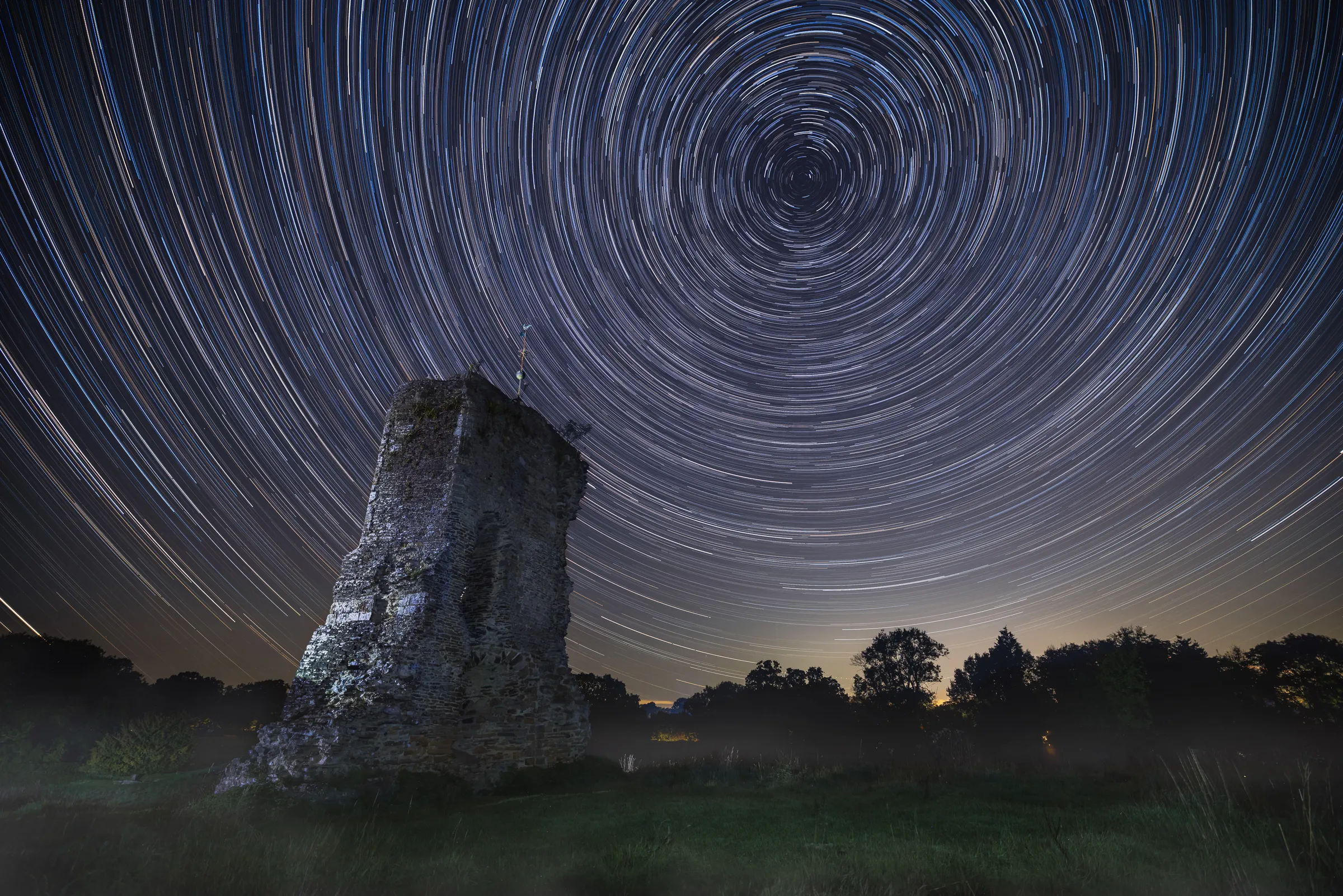 The mist complicated the shoot—moisture kept forming on my lens, requiring constant vigilance and careful wiping between sequences. But it also created this haunting quality, the fog swirling around the base of the ruins while the stars traced their paths through clear sky above. Stacking 192 frames revealed these circular trails centered on Polaris, the North Star that has guided travelers for millennia while Knepp Castle slowly crumbled beneath it.
