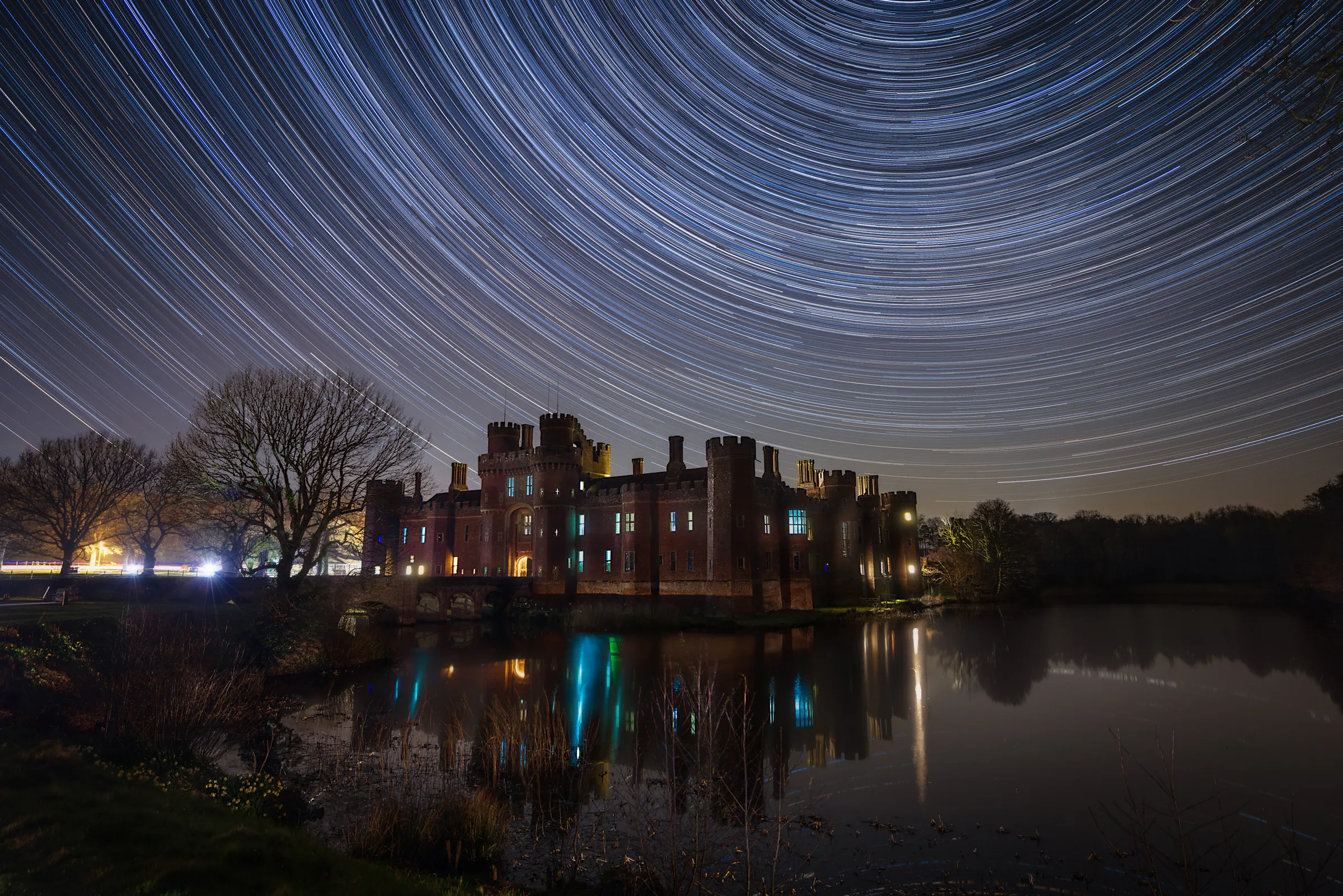 Herstmonceux Castle mirrored in the moat, with sweeping star trails arcing across the sky above.