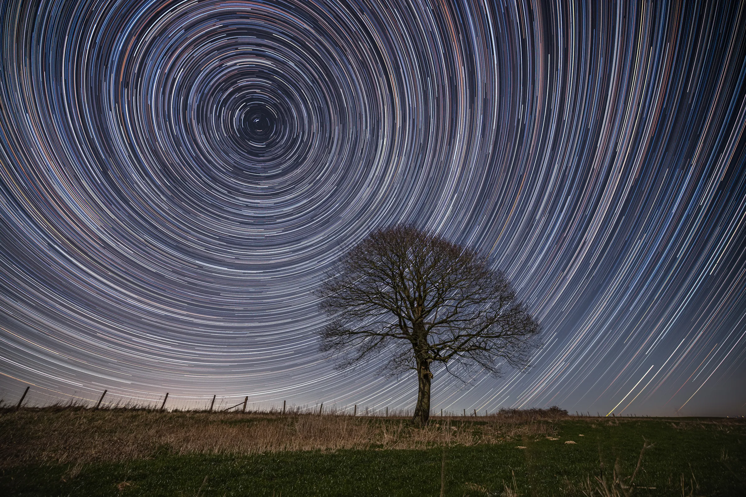Using my RF 15-35mm lens at its widest 15mm and f/2.8, I captured this solitary tree beneath the cosmic vortex. The faint orange glow on the horizon—light pollution from coastal towns like Brighton and Eastbourne—adds warmth to the otherwise cold blue tones of the night. Stacking 483 exposures revealed these star trails wheeling around the North Star, showing nearly three hours of Earth's rotation.