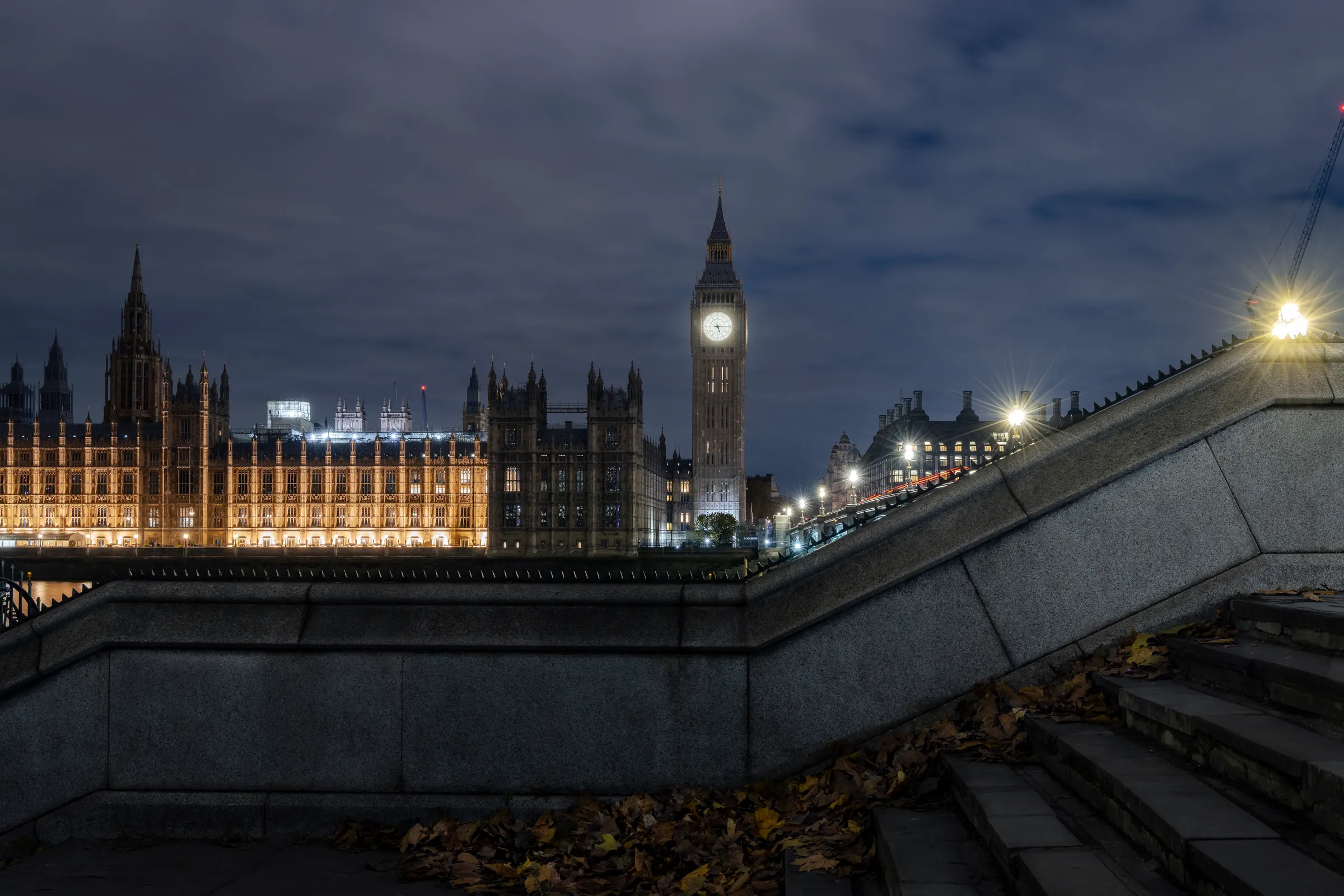 I set up my Canon R5 with the 24-105mm lens at 35mm, using a 20-second exposure at ISO 100 to capture both the illuminated Gothic Revival architecture and the deep blue tones of the night sky. The embankment stairs and autumn leaves in the foreground create natural framing, adding depth and that sense of being there on the Thames riverbank. The city felt calm for once—rare for Westminster—and this view caught that unusual mix of stillness and grandeur.