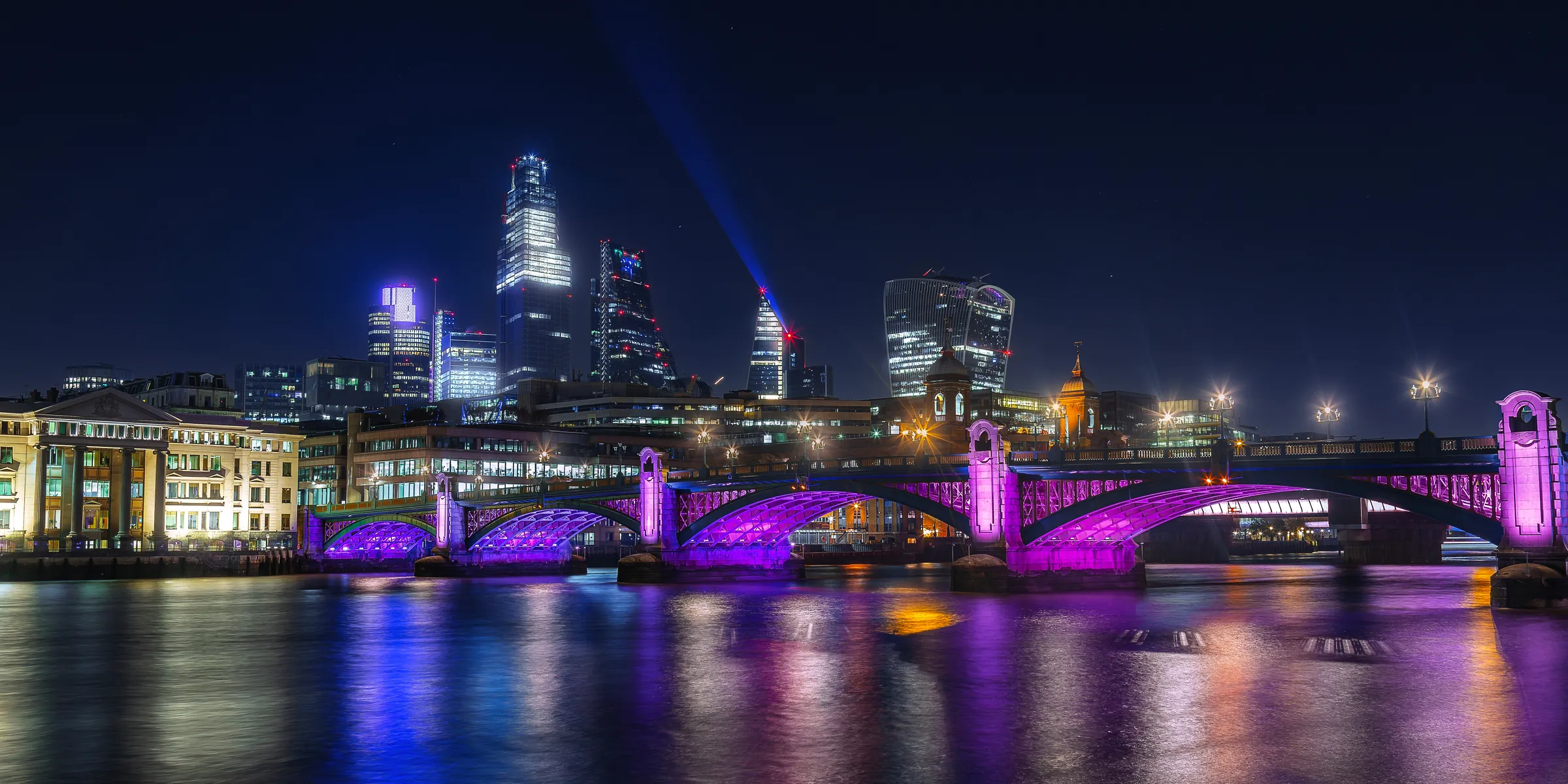 This one's full of atmosphere—bold colours, strong contrast, and that unmistakable London skyline. You've got the elegance of Southwark Bridge's 1921 iron construction up front and the energy of 21st-century architecture behind it, all reflected in the water below. The purple lighting against the warm glow of the city creates this vibrant contrast that shows London at its most dramatic.