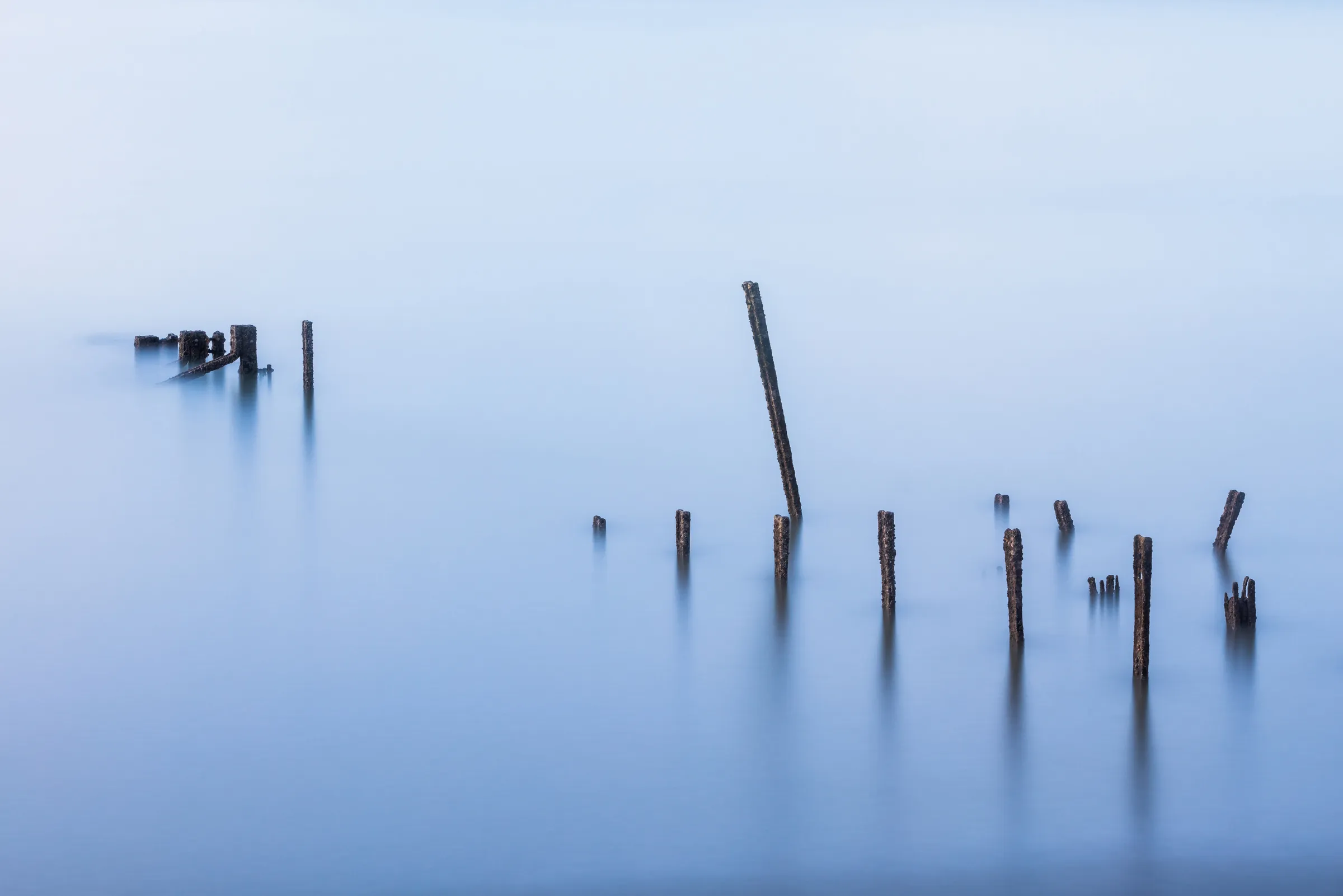 A hauntingly beautiful capture of the weathered remnants of a jetty at Newhaven, East Sussex, evoking a sense of nostalgia.