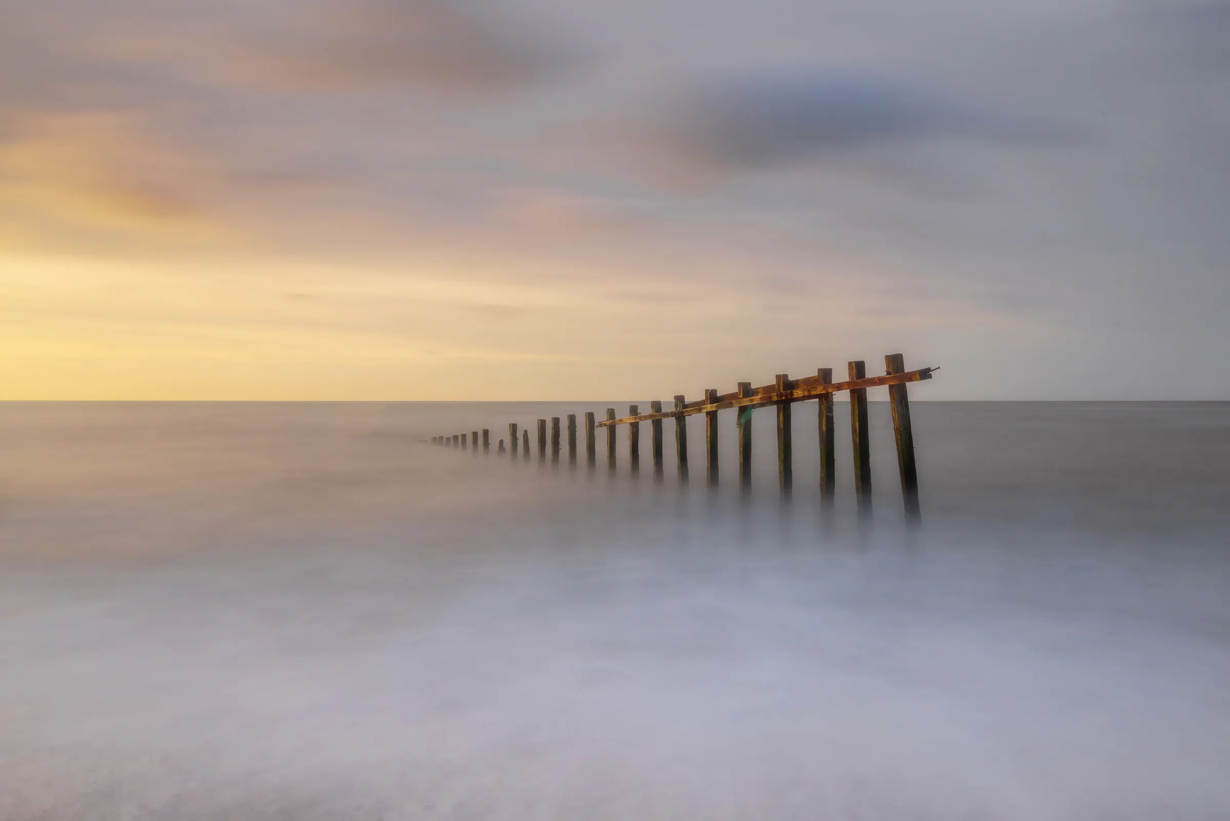 Wooden groynes fading into the sea along the Sussex shoreline.