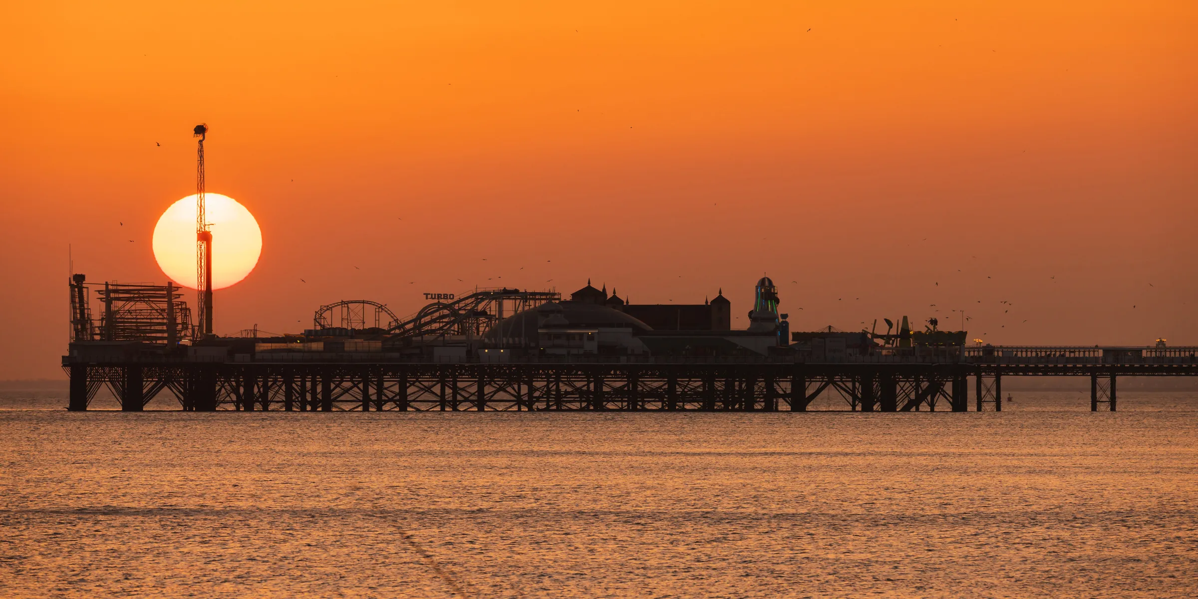 Fiery orange sunset sinking behind Brighton Palace Pier.
