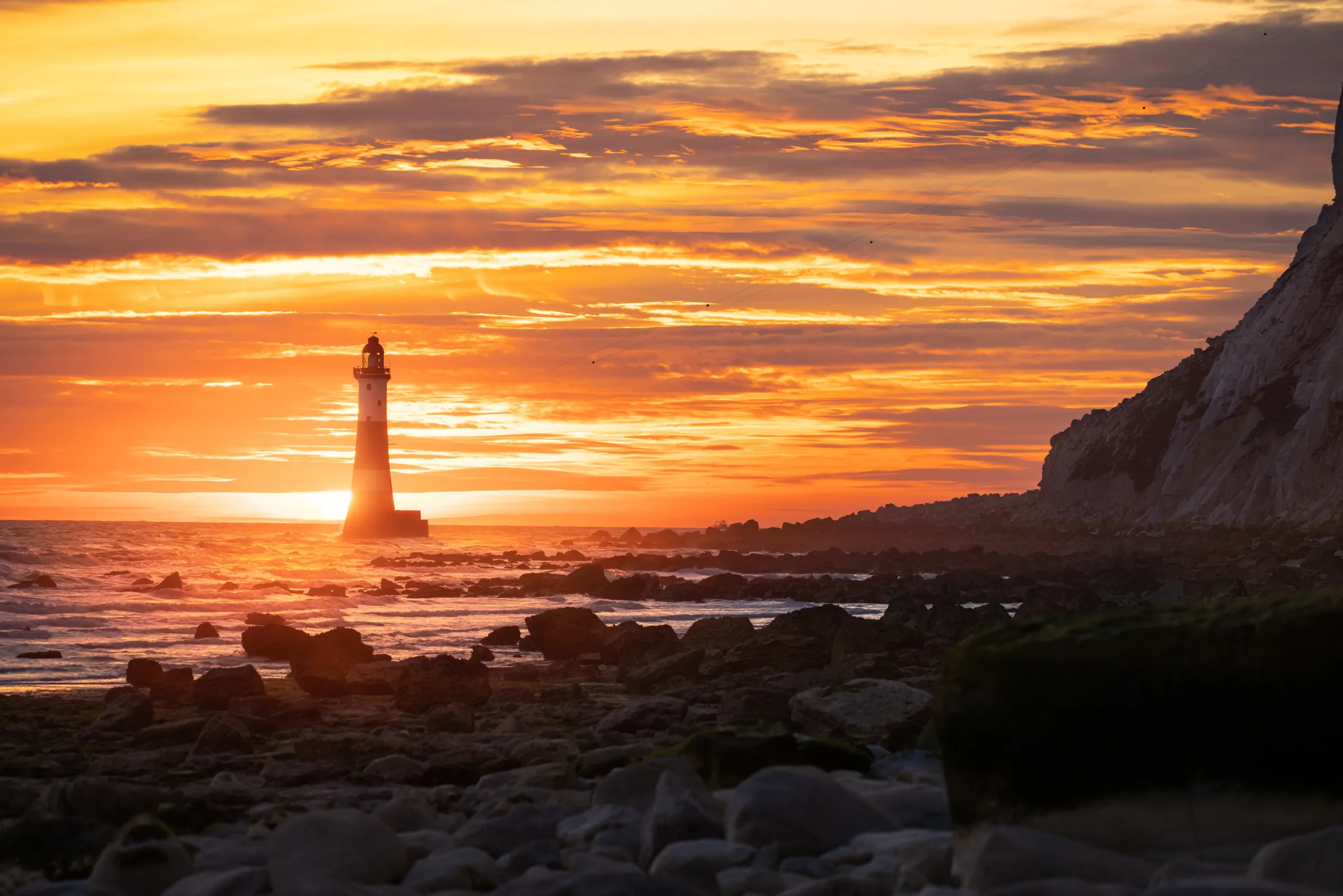 Dramatic skies framing the iconic Beachy Head Lighthouse at sunset.