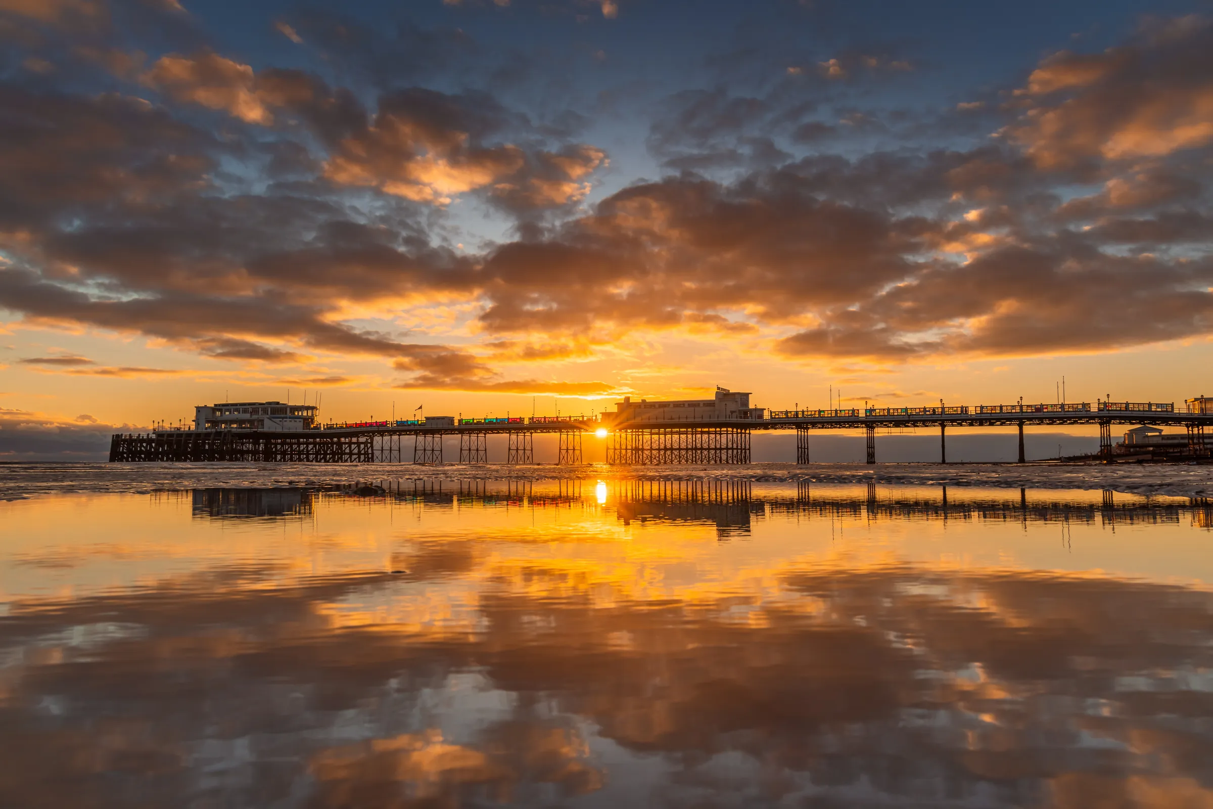 As dawn broke, the sky exploded with colour. Warm golds and fiery oranges spread across the horizon, and the reflection in the shallow water left by the receding tide was absolutely stunning. Worthing Pier stood in perfect silhouette, its elegant Victorian structure mirrored in the wet sand below. I worked quickly to capture this panoramic composition, knowing that these conditions—the perfect tide level, the calm water, the brilliant sunrise—wouldn't last long.