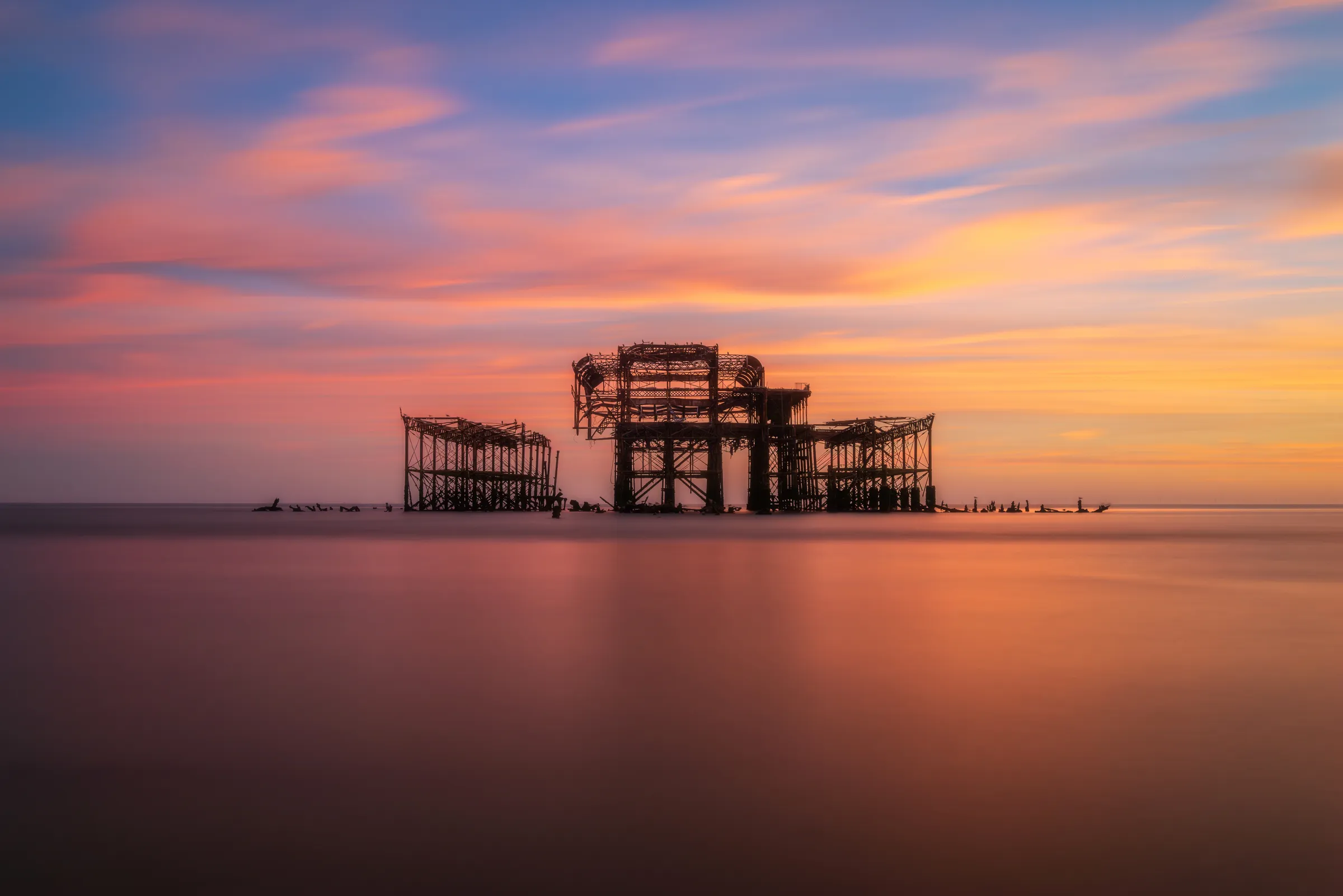 The skeletal ruins of Brighton’s West Pier bathed in evening light.