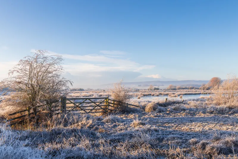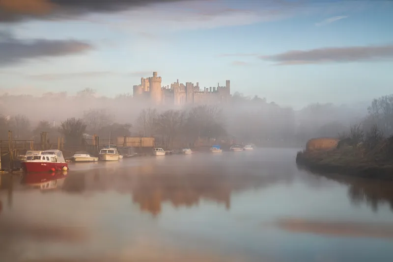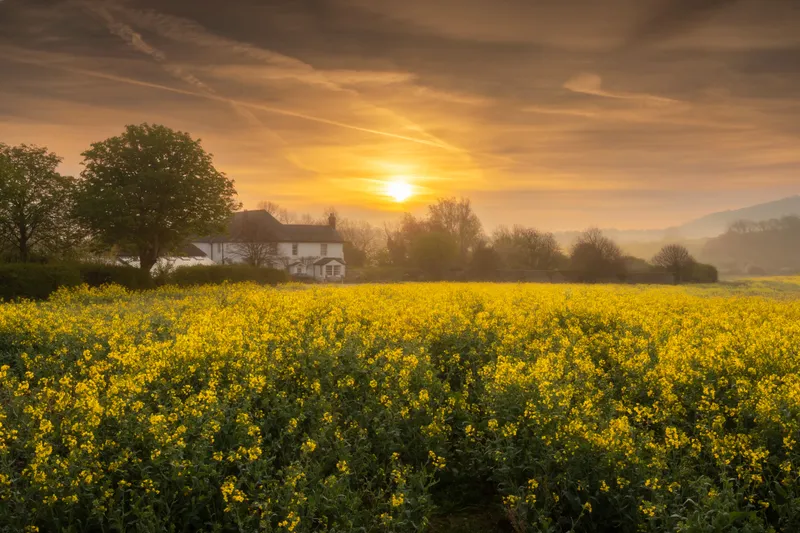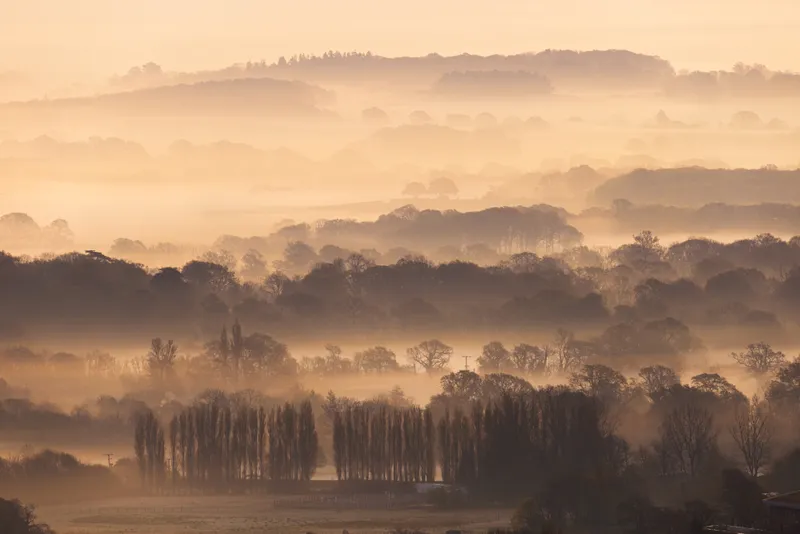 Soft mist drifting over a rural Sussex landscape at dawn.