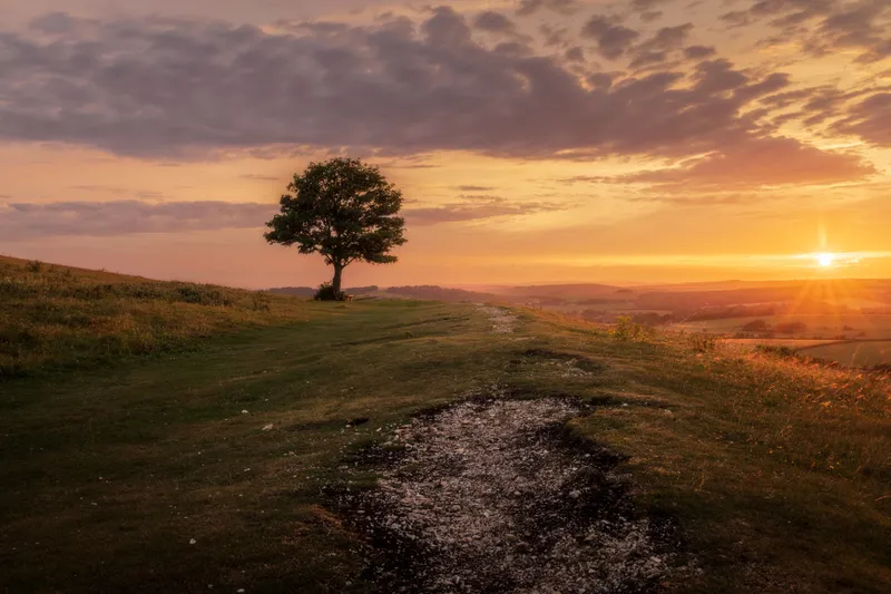 A lone tree silhouetted against a glowing South Downs sunrise.