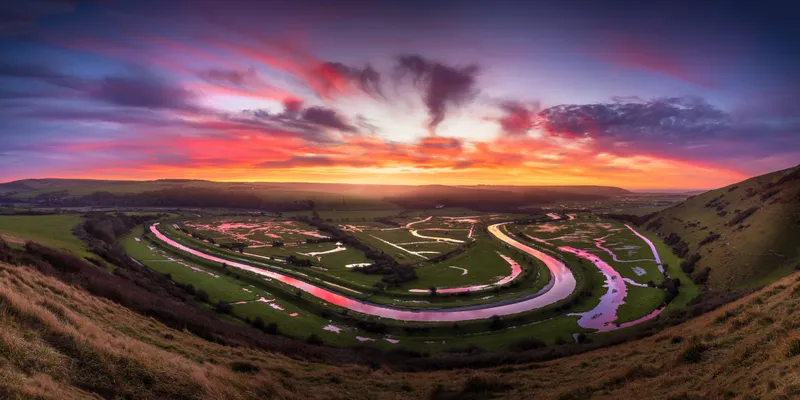 Sweeping sunrise view from High and Over across the Cuckmere Valley..