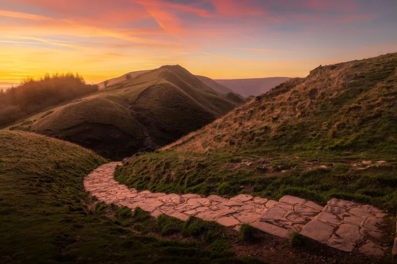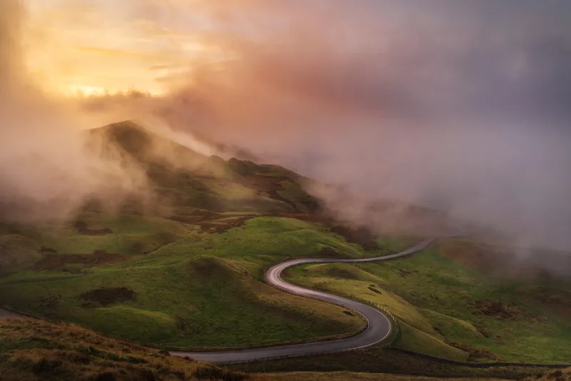 A snaking road leading to a cloud covered Mam Tor in the Peak District.