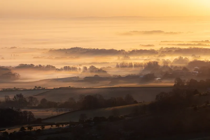 Sunrise light and valley mist revealing converging ridges of the South Downs.