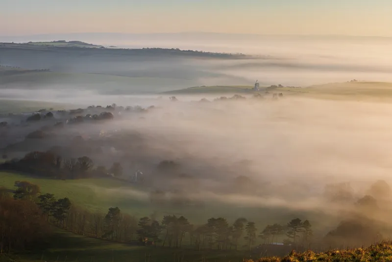 Historic Ashcombe windmill enveloped in dawn mist on the Downs.
