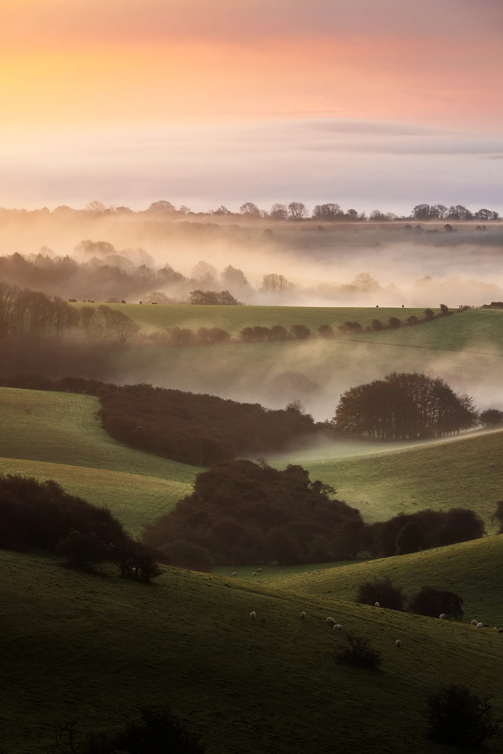 I wanted this photograph to feel calm but structured—a portrait of the Downs where the geometry of the landscape does the talking. There’s no single hero element here; it’s about how all the pieces connect: light, mist, ridges, and trees working together in one frame. When you look at Convergence, I want you to feel that quiet pull into the distance, following the lines of the land as they meet and cross under a new day’s light.