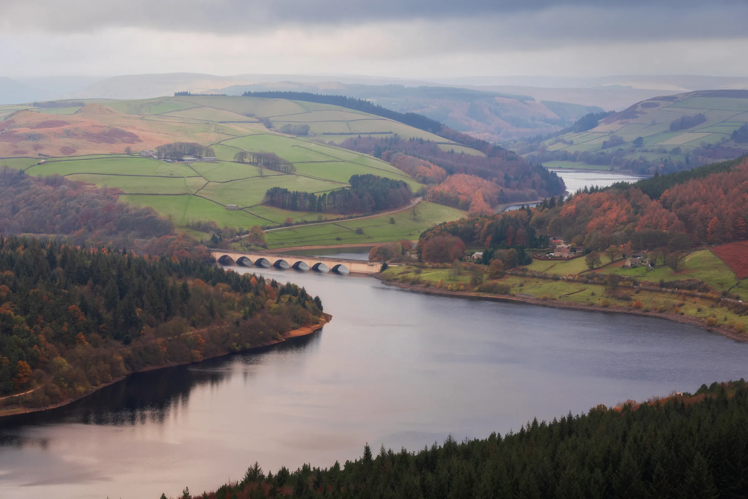 The sweeping view from this elevated vantage point reveals the graceful arches of the Ashopton Viaduct, standing as both an engineering marvel and an elegant focal point. Framed by a mix of evergreen and deciduous woodlands, the scene is enriched with the warm hues of autumn, where copper-toned foliage contrasts against the deep greens of the surrounding forests. Beyond the reservoir, distant hills fade into a soft mist, adding a dreamlike quality to the composition.