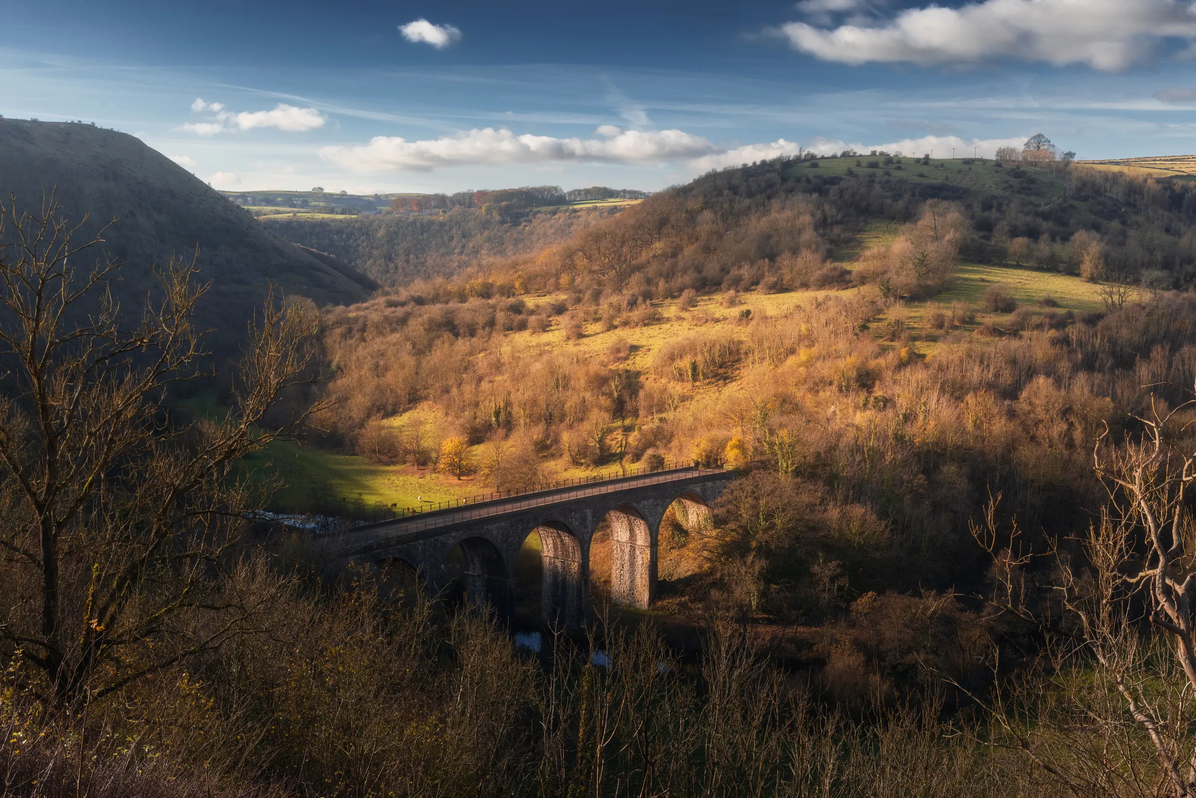 This view captures the viaduct bathed in warm light, nestled within a patchwork of rolling hills and woodlands tinged with late-season hues. The sunlight highlights the contours of the land, revealing the depth of the valley, while shadows stretch across the scene, adding drama and texture. Above, wisps of cloud drift lazily across a clear blue sky, enhancing the sense of openness and tranquillity.