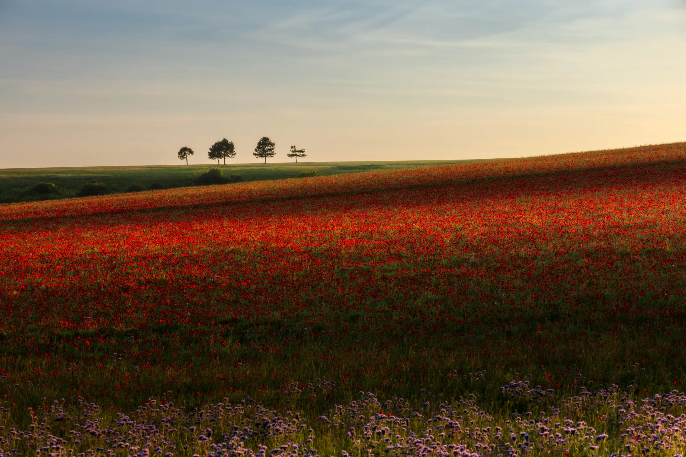 There’s something about the last light of day that feels like a pause. I was walking a quiet ridge in the South Downs when I saw this scene open up. ows of scarlet poppies catching the sun just before it dipped away. The hillside was glowing, but it was the five trees standing along the horizon that really anchored the frame. Perfectly spaced, gently silhouetted, they seemed to be watching over the field like quiet guardians.I stayed longer than I planned, just taking it in. The stillness, the colour, the fleeting light—it all came together for one of those moments that stays with you.