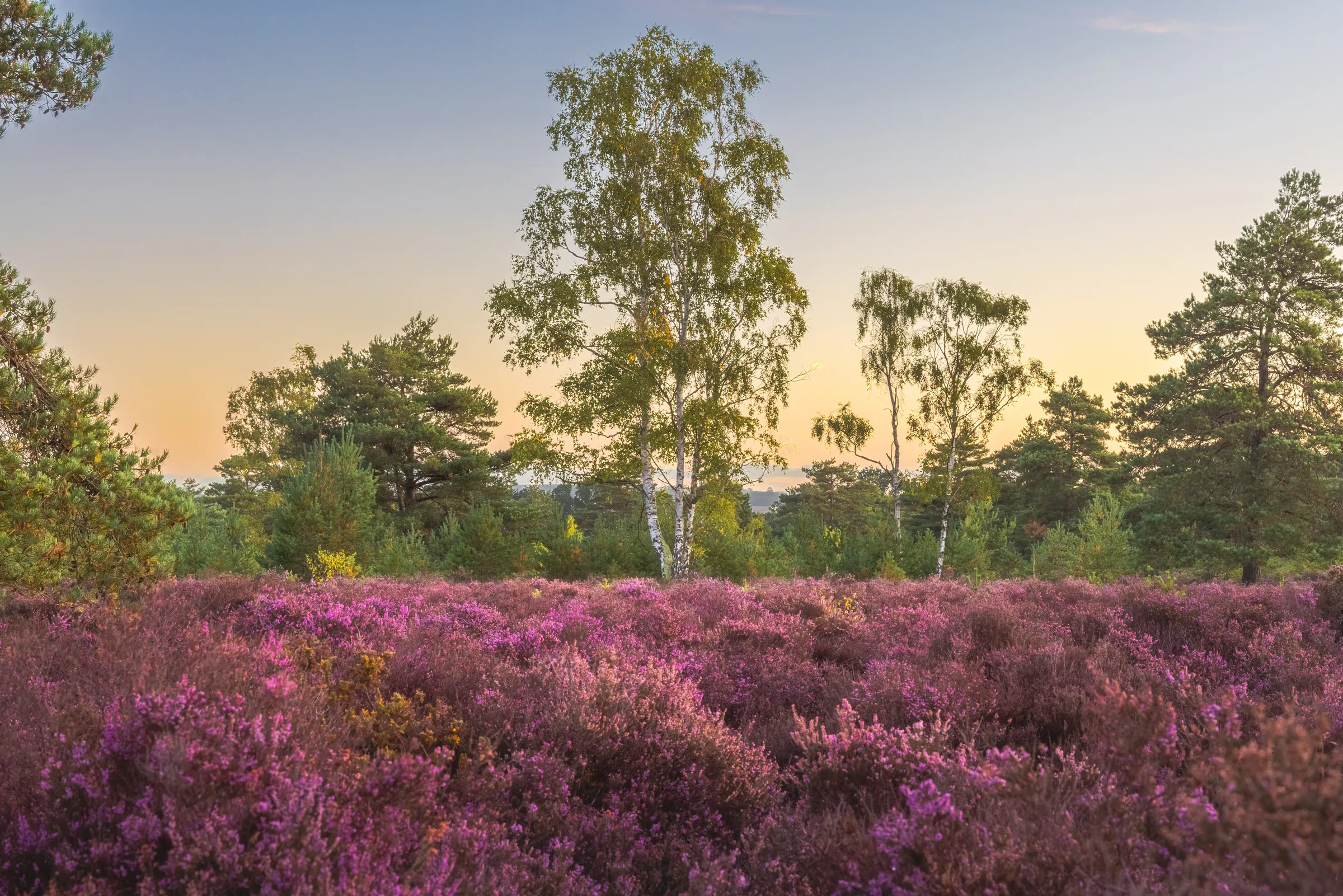 The early morning light was doing beautiful work here. It cast this soft glow that highlighted the delicate branches and leaves of the birches, making their pale trunks almost luminous. The heather surrounding them was in full bloom, that rich purple stretching out endlessly. Above, the sky was mixing soft blues with pastel yellows—those gentle dawn colours that only last for minutes after sunrise.