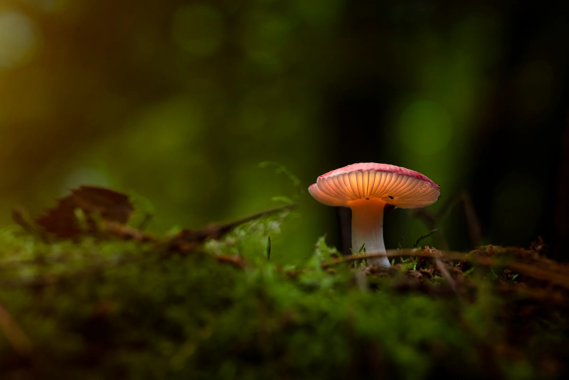 Emerging from a bed of vibrant moss, this delicate mushroom glows softly against the deep greens of the woodland, creating an almost otherworldly atmosphere. The intricate gills, kissed by warm light, add to its mystical presence, as if it holds a secret waiting to be discovered.