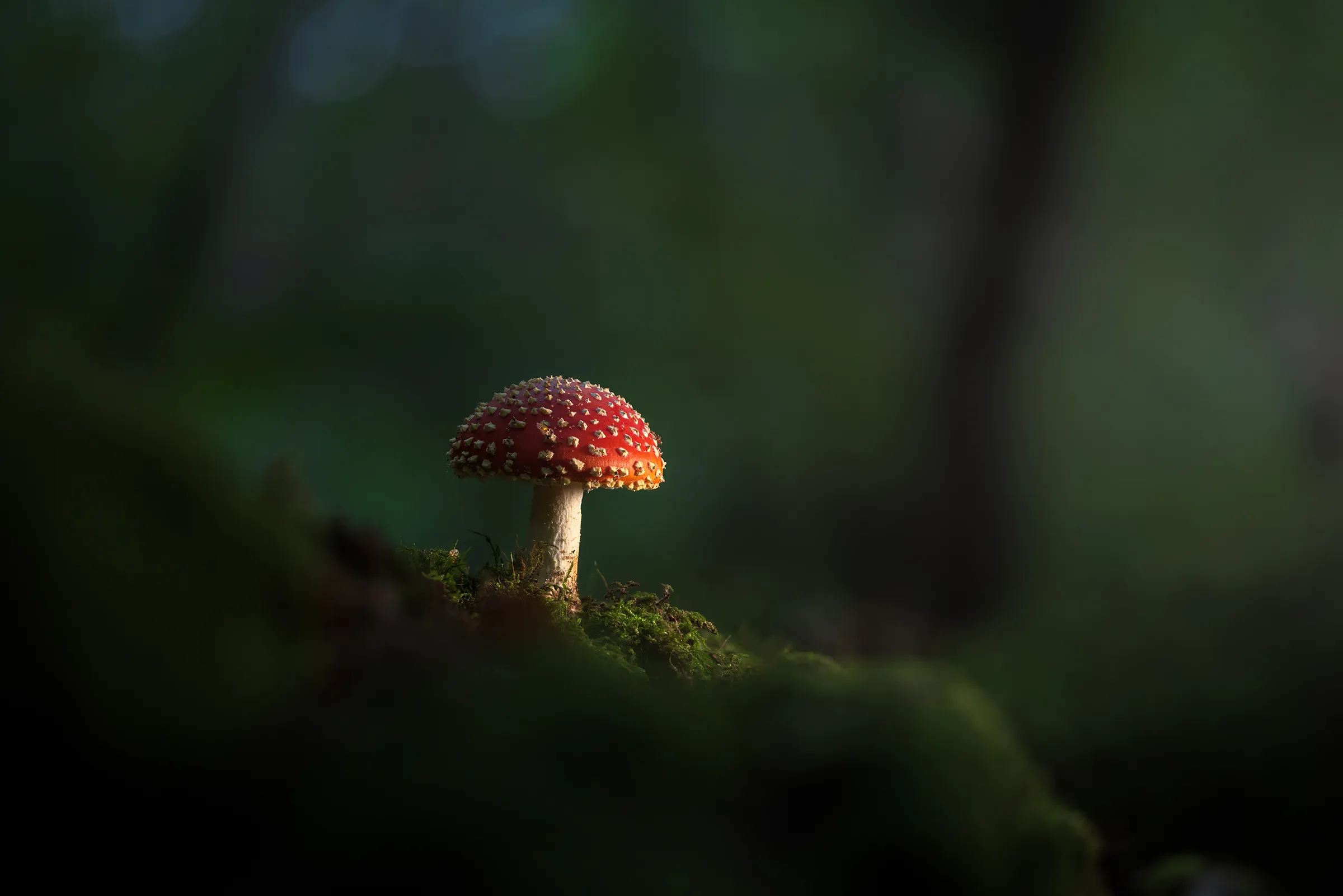 A single fly agaric standing proud amongst a mossy woodland, illuminated in still light against a deep forest backdrop.