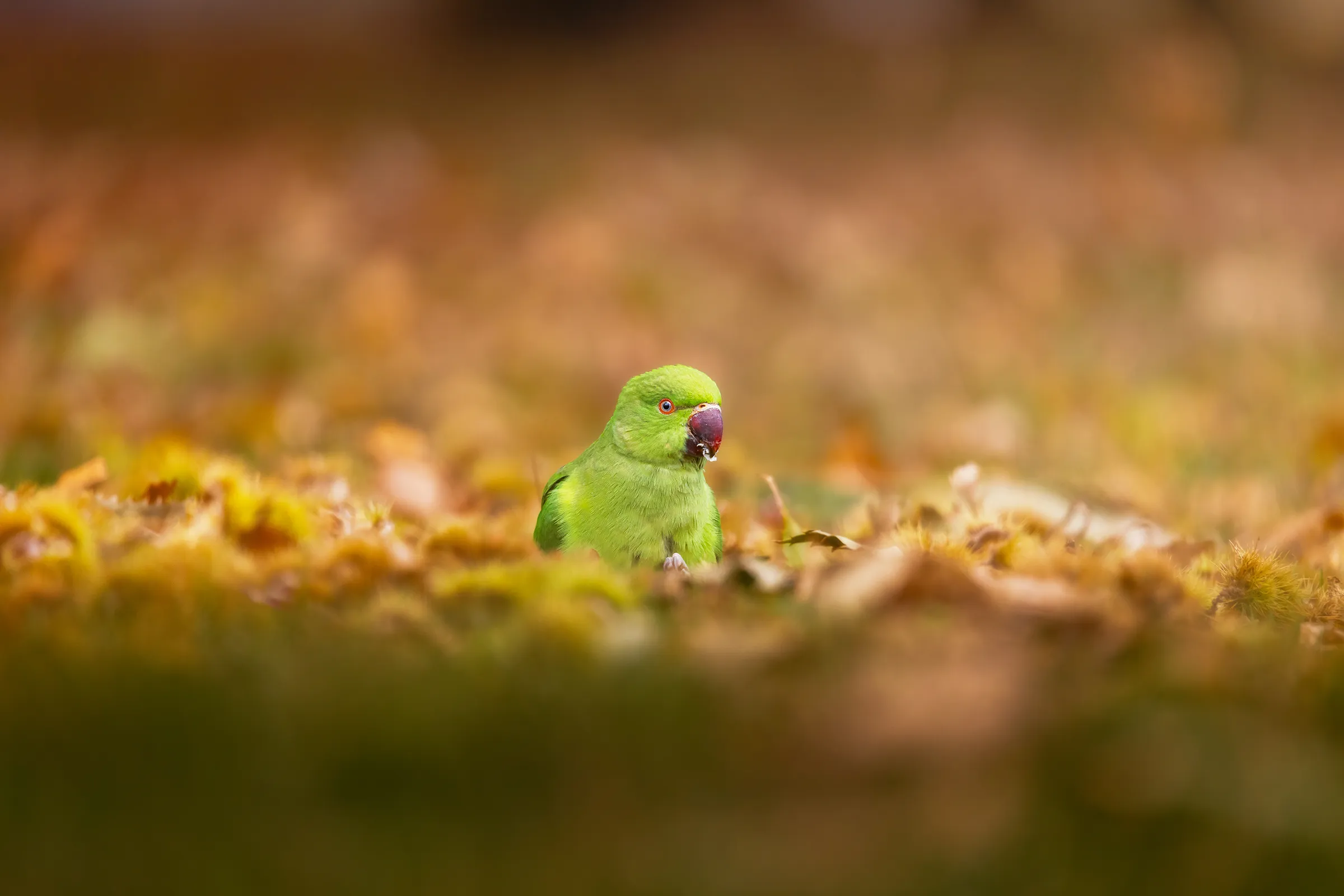 In the gentle stillness of an autumn afternoon, a ring-necked parakeet pauses among fallen leaves, creating a moment of perfect tranquility. Autumni Quies—autumn's quiet—captures that peaceful interlude between activity and rest, when even the most energetic creatures surrender to the season's languorous charm.