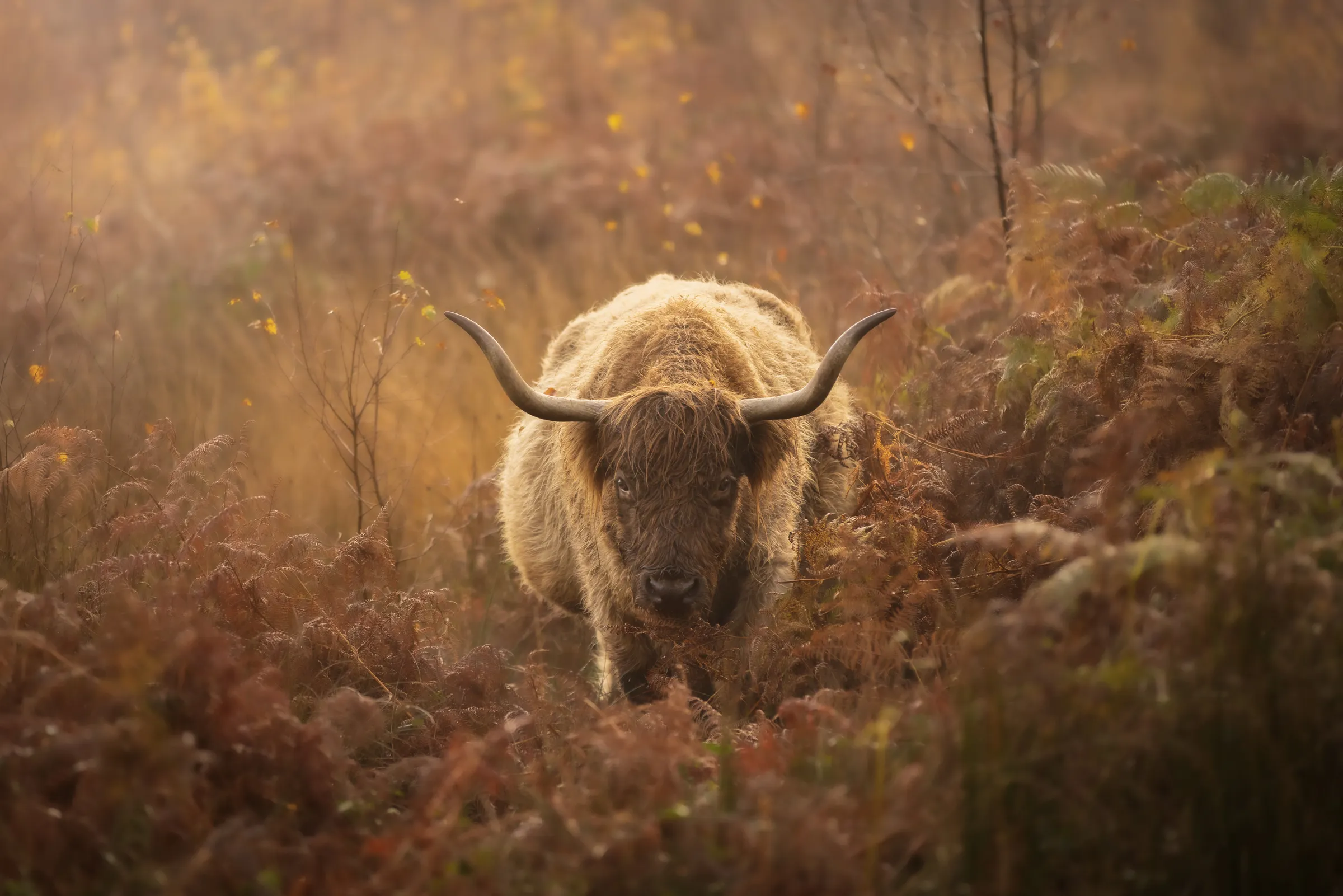 This dramatic photograph captures a Highland cow, camouflaged in the bushes, marching confidently toward the camera. The thick, shaggy fur of the cow blends beautifully with the surrounding foliage, creating a powerful and captivating wildlife moment.