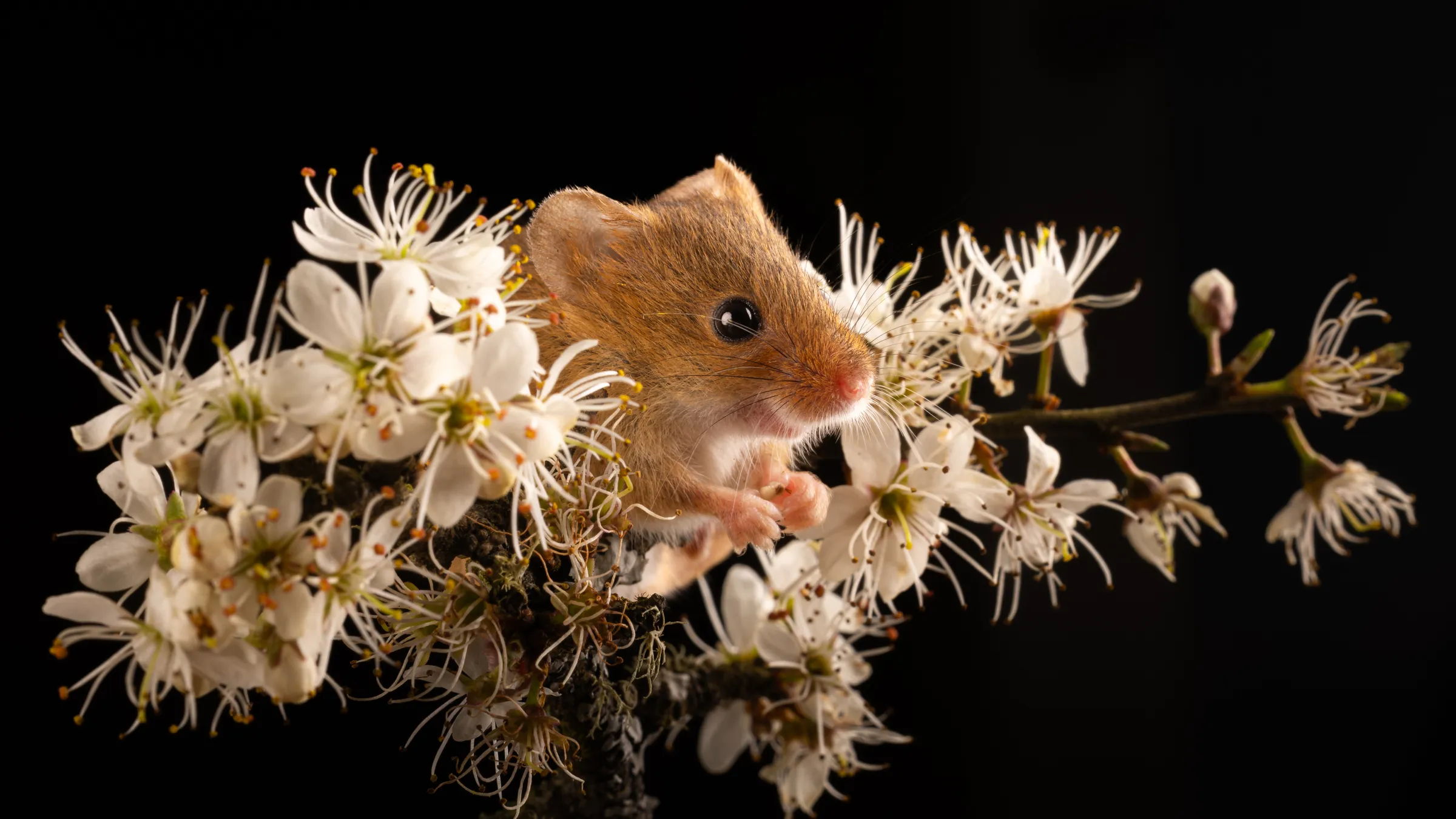 A delicate harvest mouse, nestled among the soft white blossoms, embodies the fragile beauty of nature. Its tiny paws clutch the branch, its fur catching the light against a rich black backdrop, making this intimate wildlife moment feel almost magical.