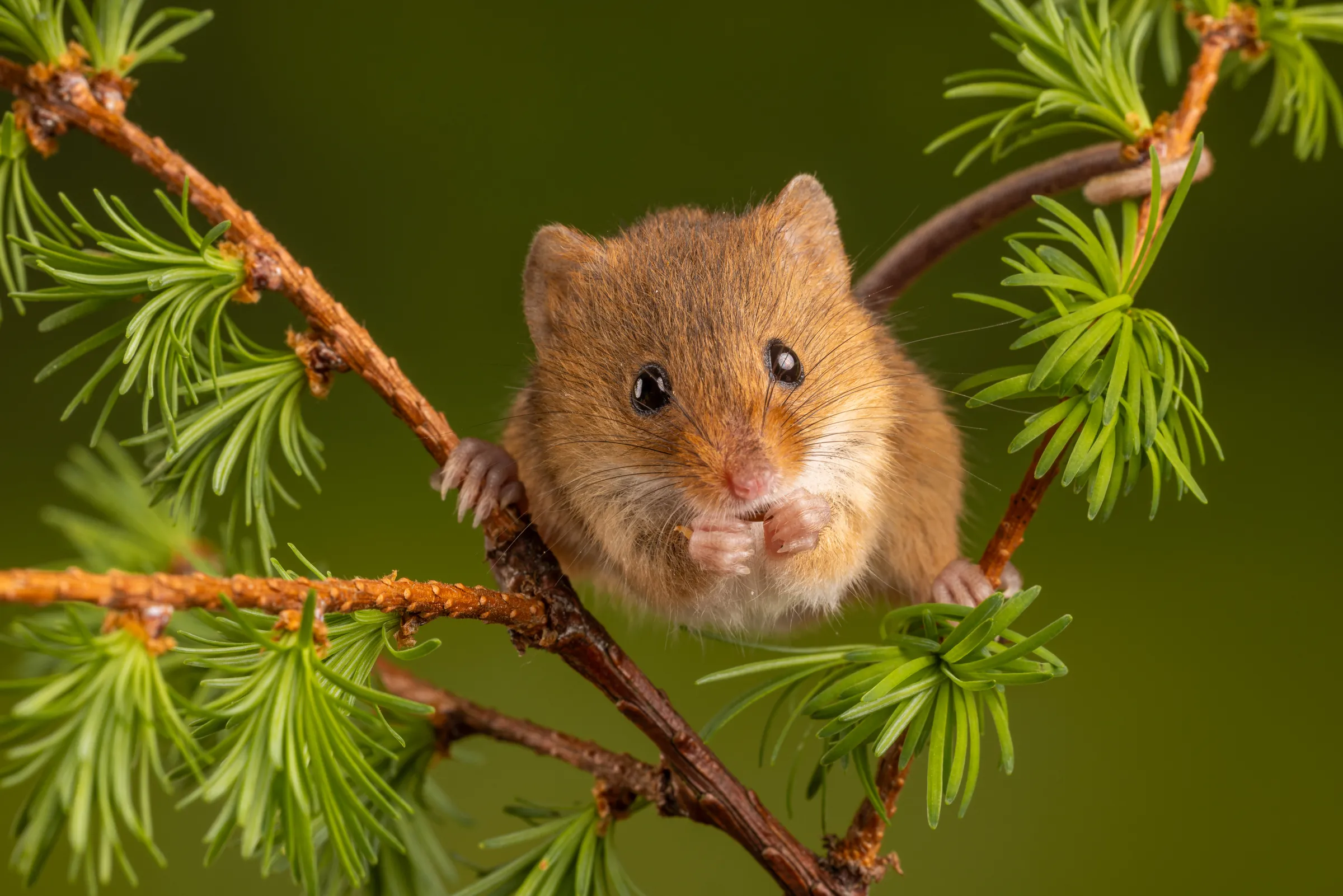 This delightful photograph features a harvest mouse gripping a tiny branch with its back paws. The mouse’s delicate form contrasts beautifully with the intricate textures of the branches, creating a captivating moment of wildlife in action.