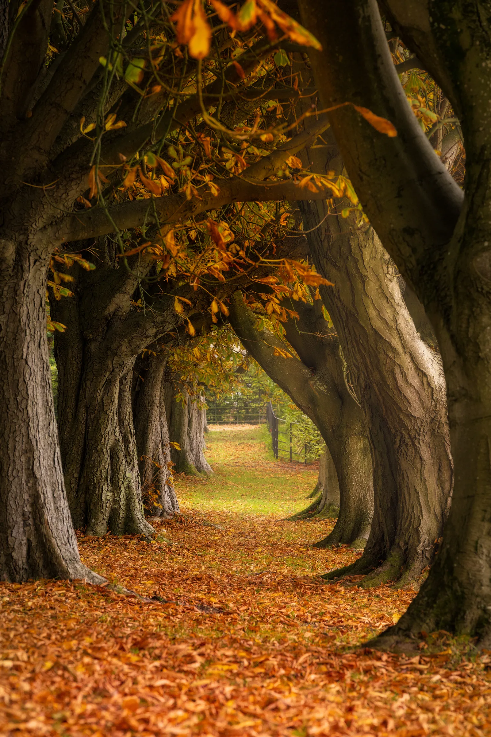 An avenue of chestnut trees in full autumn colour, their branches arching overhead to form a golden tunnel through the quiet countryside of Steyning.