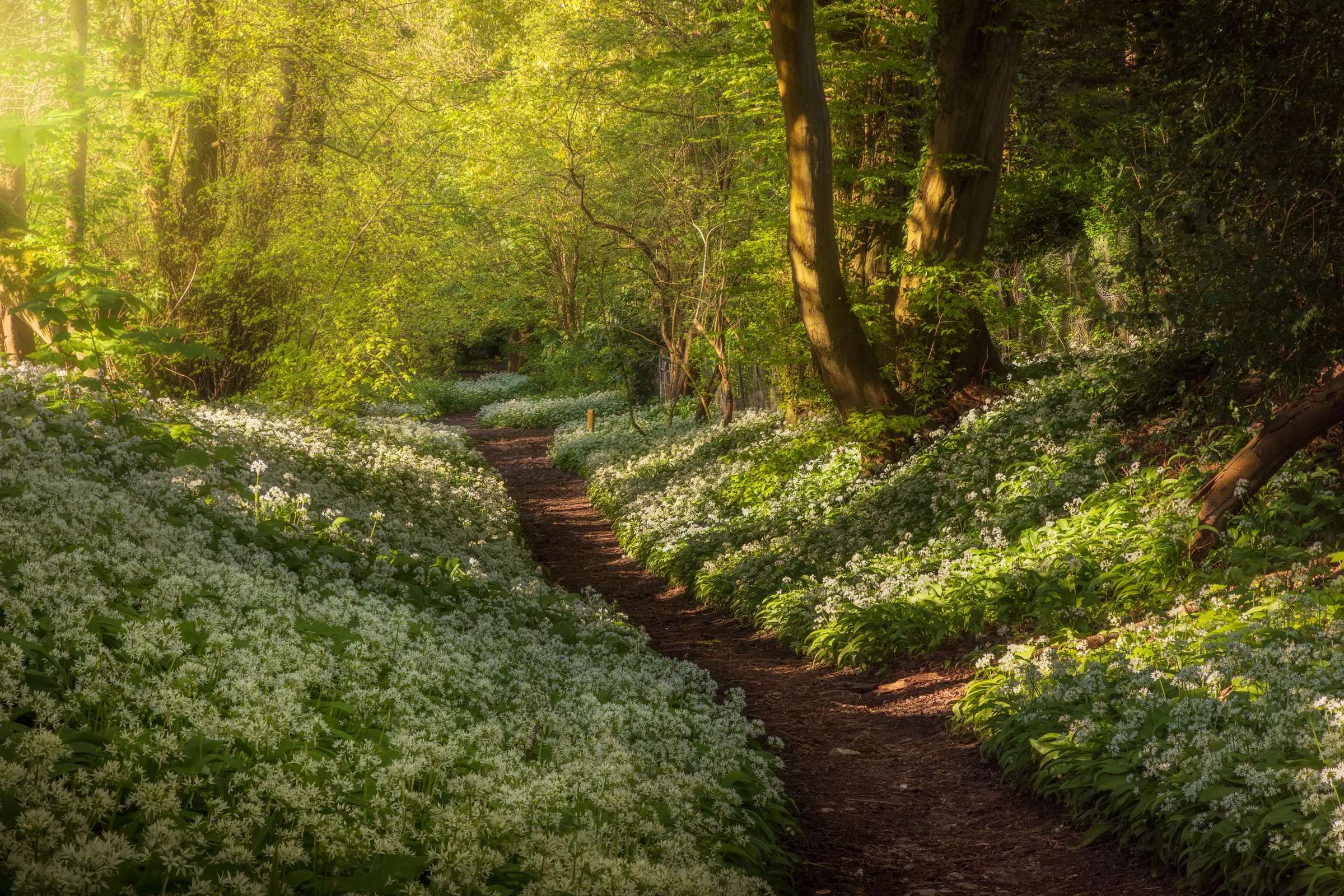 What makes wild garlic season so special isn't just the visual spectacle, but the scent. As I walked down the narrow footpath, surrounded by this sea of white flowers, the air was thick with that distinctive, pungent garlic aroma. The evening light was filtering through the canopy in these beautiful soft rays, illuminating the flowers and creating this almost ethereal atmosphere.