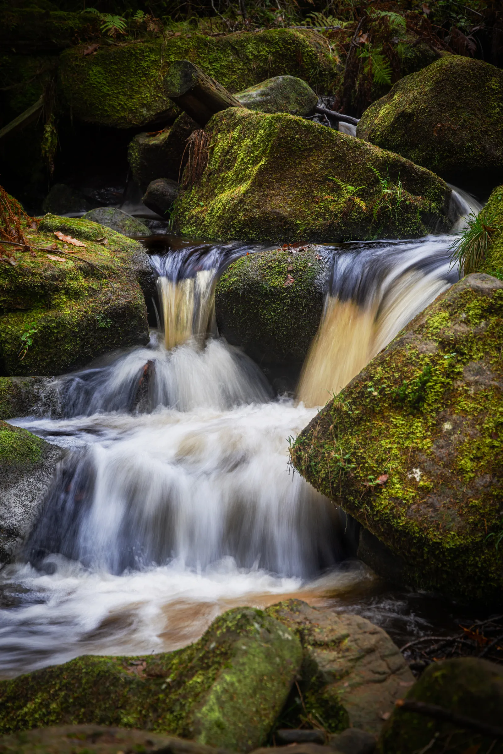 I was drawn to how the brook's cascading energy tumbles over these rugged rocks, with the white-crested flow contrasting so dramatically against the deep emerald tones of the surrounding moss and foliage. Using careful long-exposure photography, I captured that soft, silky appearance of the water—creating this sense of perpetual movement—while the moss-covered stones stand in quiet defiance, their surfaces shaped by centuries of flowing currents.