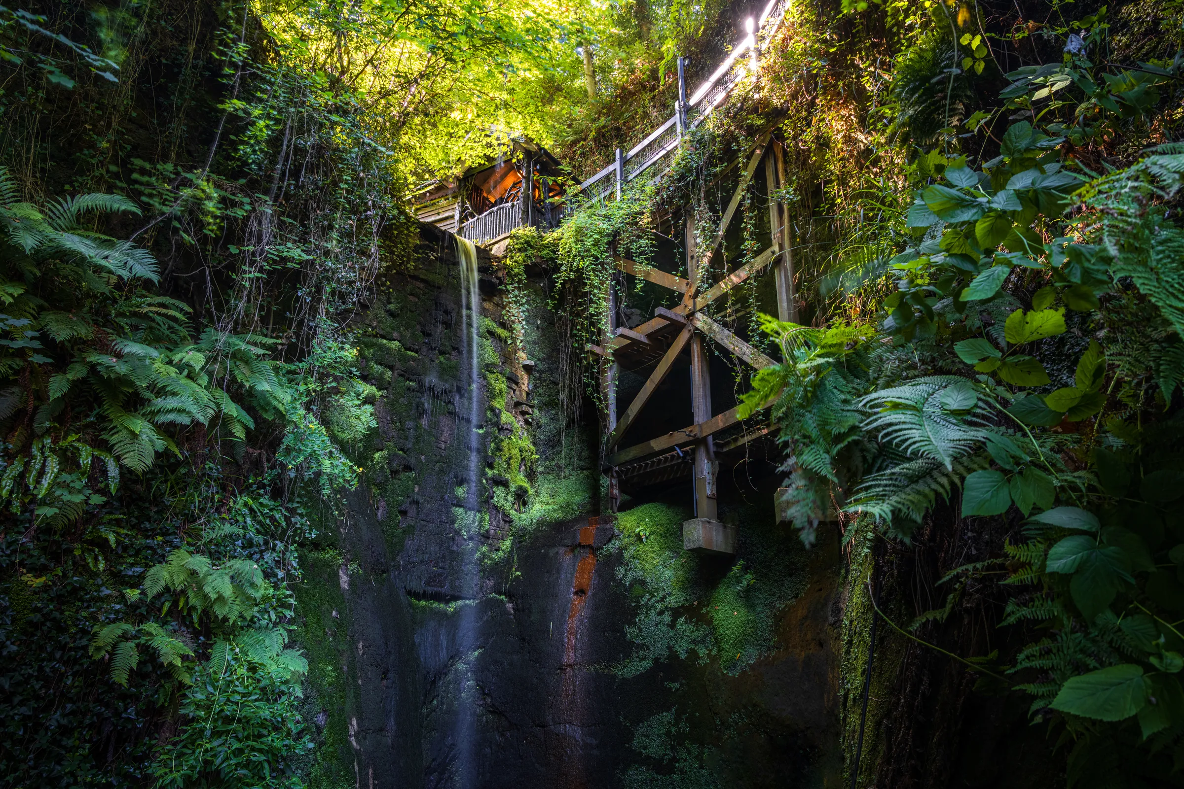 I visited on a bright August morning when the sunlight was filtering through the dense canopy overhead, creating these beautiful shifting patterns on the rugged walls. Everywhere you look, there's life—ferns and ivy cling to every crevice, vibrant moss covers the rocks, and delicate streams wind their way down through the gorge. The old wooden bridge and weathered structures hint at the human connection to this place, blending the island's rich history with the landscape's untamed beauty.